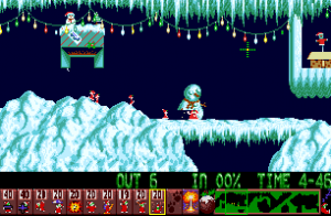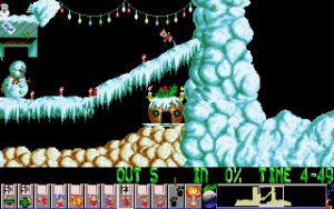 There’s a Christmas theme over everything now, even the menus. The lemmings are now clad in red coats and Santa hats, and even the entrance they fall out from is wrapped up in gift paper. There’s only one level theme, but there are a lot of animated decorations like bouncing snowmen that look pretty nice. The soundtrack’s full of MOD versions of songs like “Jingle Bells” and “Rudolf The Red-Nosed Reindeer,” which all sound pretty good.