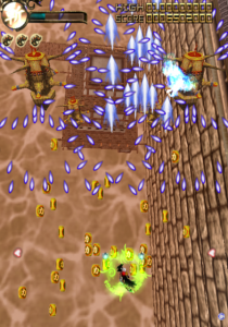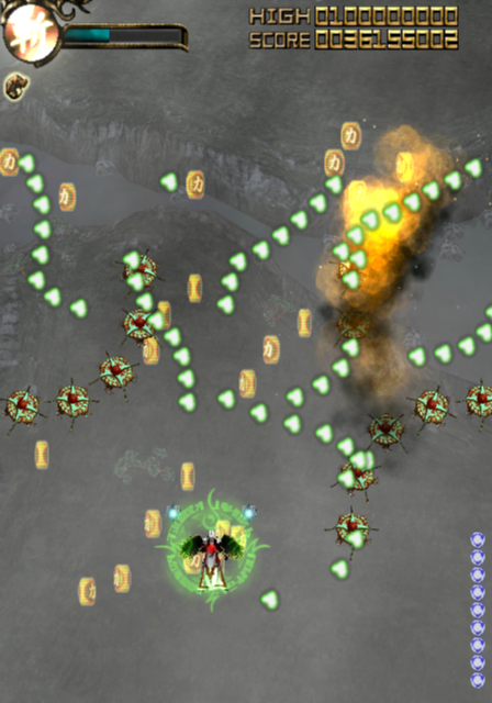 The Shoot button is the one that you probably will be keeping pressed most of the time. There are a few enemies that release projectiles when you kill them, but otherwise it is safe to fire as much as you can. As previously mentioned, Homura has on default two orbs at his sides that expand the firepower, and this options can be increased (à la Gradius style) up to a total of four, adding considerably to the damage the player can cause. To do so you must fill the horizontal bar of the HUD by collecting the “Chikara” (“power”) coins that scatter on the screen each time you kill an enemy (also very reminiscent of the Shikigami no Shiro games). The more Chikara you get, the better, since they also serve in increasing the overall score.