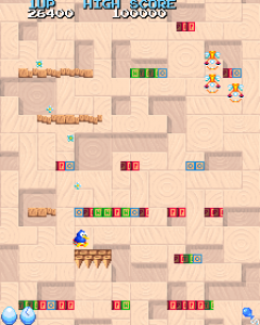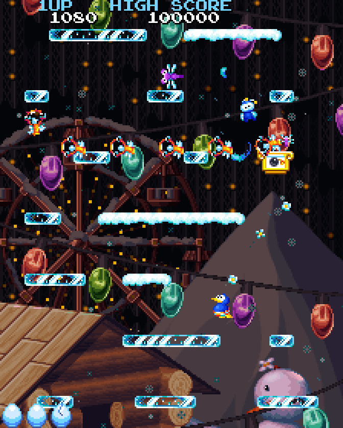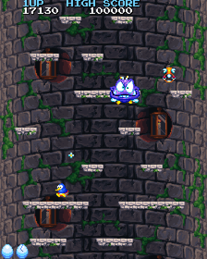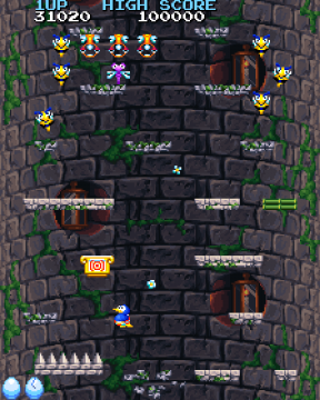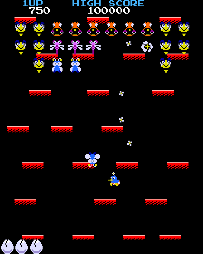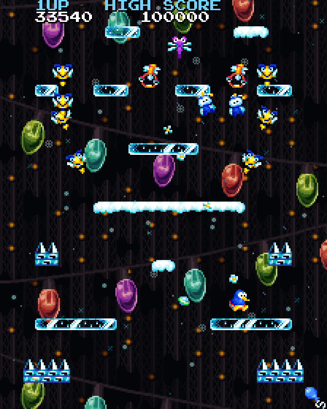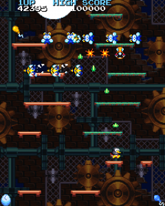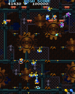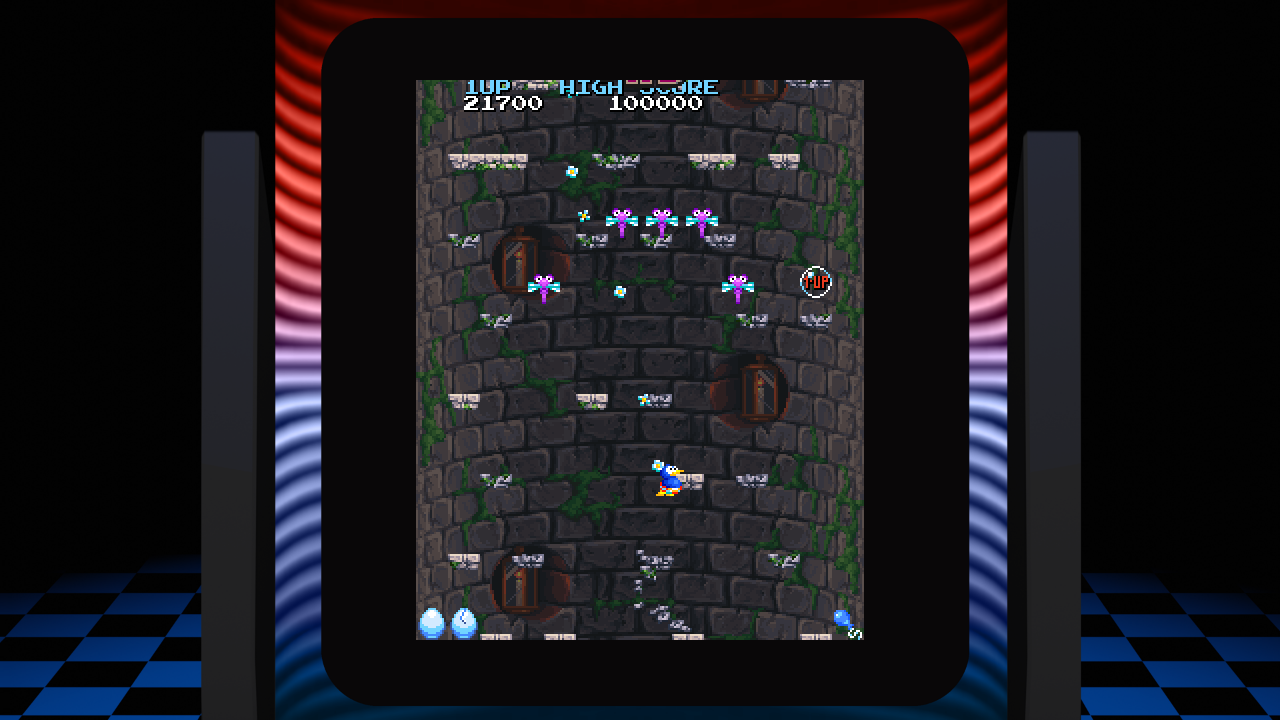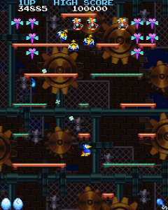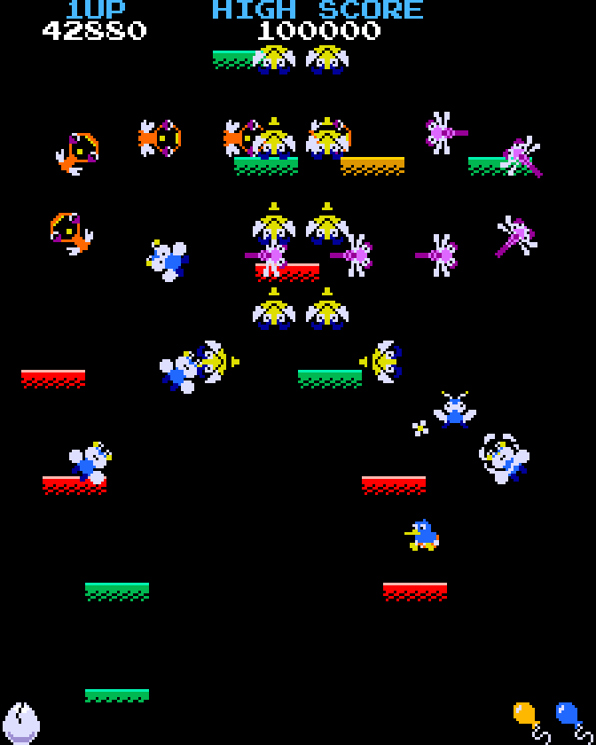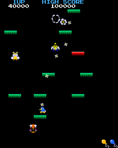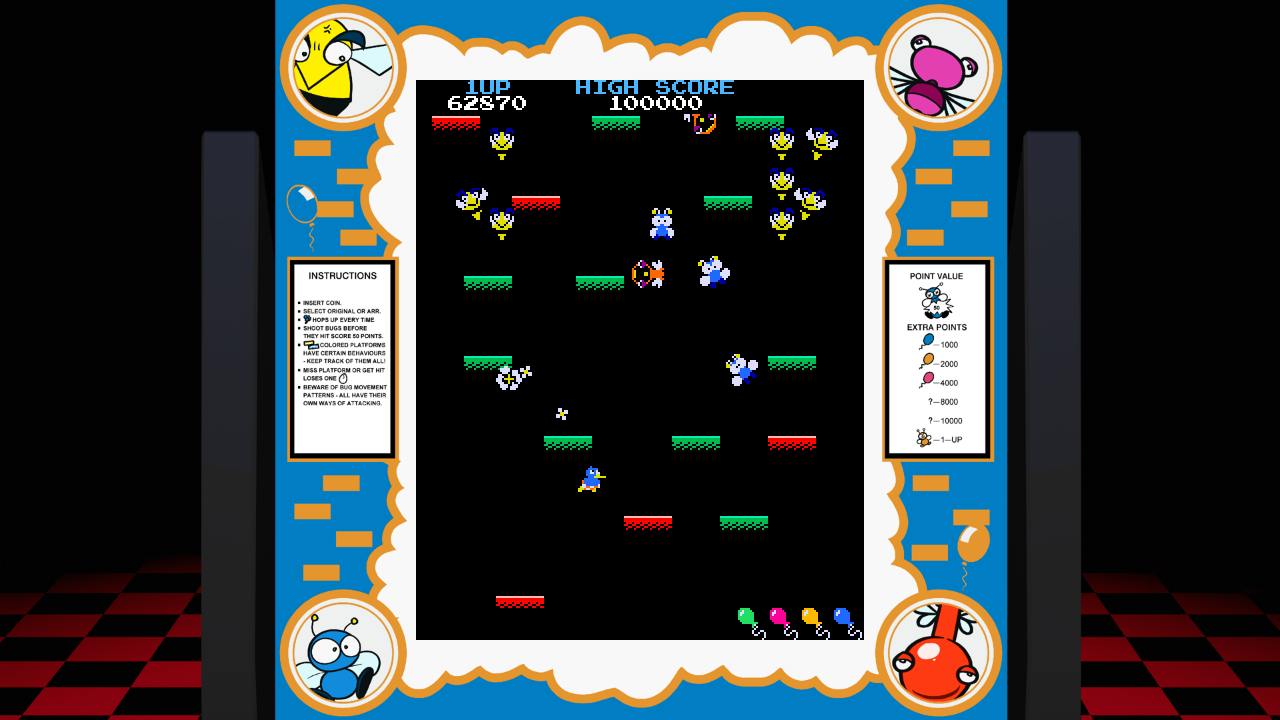 Careful maneuvering is required, not just because platforms vary in size and some will immediately collapse after a single landing, but to also avoid the different attacks dealt by the four bug types. Eeny the bluebottle fires a projectile before dive bombing down the side, Meeny the wasp homes in on you, Miny the dragonfly drops bombs whilst flying overhead, and Moe the firefly repeatedly flies into the top of the screen and up from the bottom.