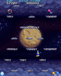 The bugs take a few seconds to fly into formation and briefly linger between attacks, so you’re not constantly under assault. Still, it’s a fast-paced game as you juggle the platforms, obstacles and the enemy attacks, with waves usually lasting 15-30 seconds. They’ll go even faster if you land on a power-up platform that briefly gives you homing fireworks, explosive rockets and a double-shot. You’re encouraged to take everyone out quickly, lest you face the wrath of the massive Tiger who blocks your shots and regularly plummets towards you.