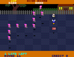 Mappy‘s only true arcade sequel came in the form of the 1986 release Hopping Mappy. (“Hopping” is a verb in English, but in Japanese it’s a noun, for the word “pogo stick”.) All characters now bounce on pogo sticks, and the screen is divided into a grid. The goal, as before, is to obtain all of the items in the stage, and gathering matched items will result in extra points. Mewkies will bounce back and forth, so avoiding them is simply a matter of timing, but Goro moves in a less predictable zig-zag pattern.