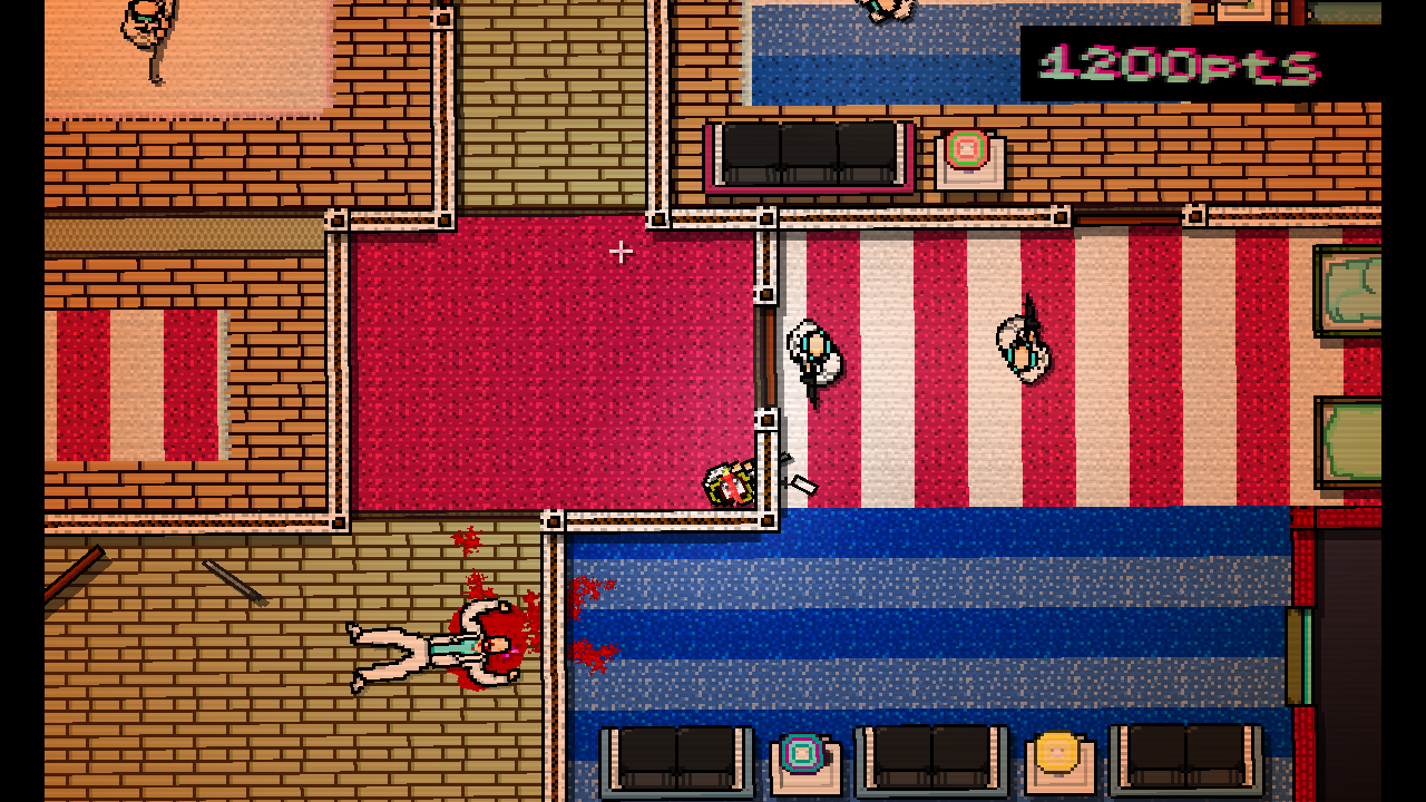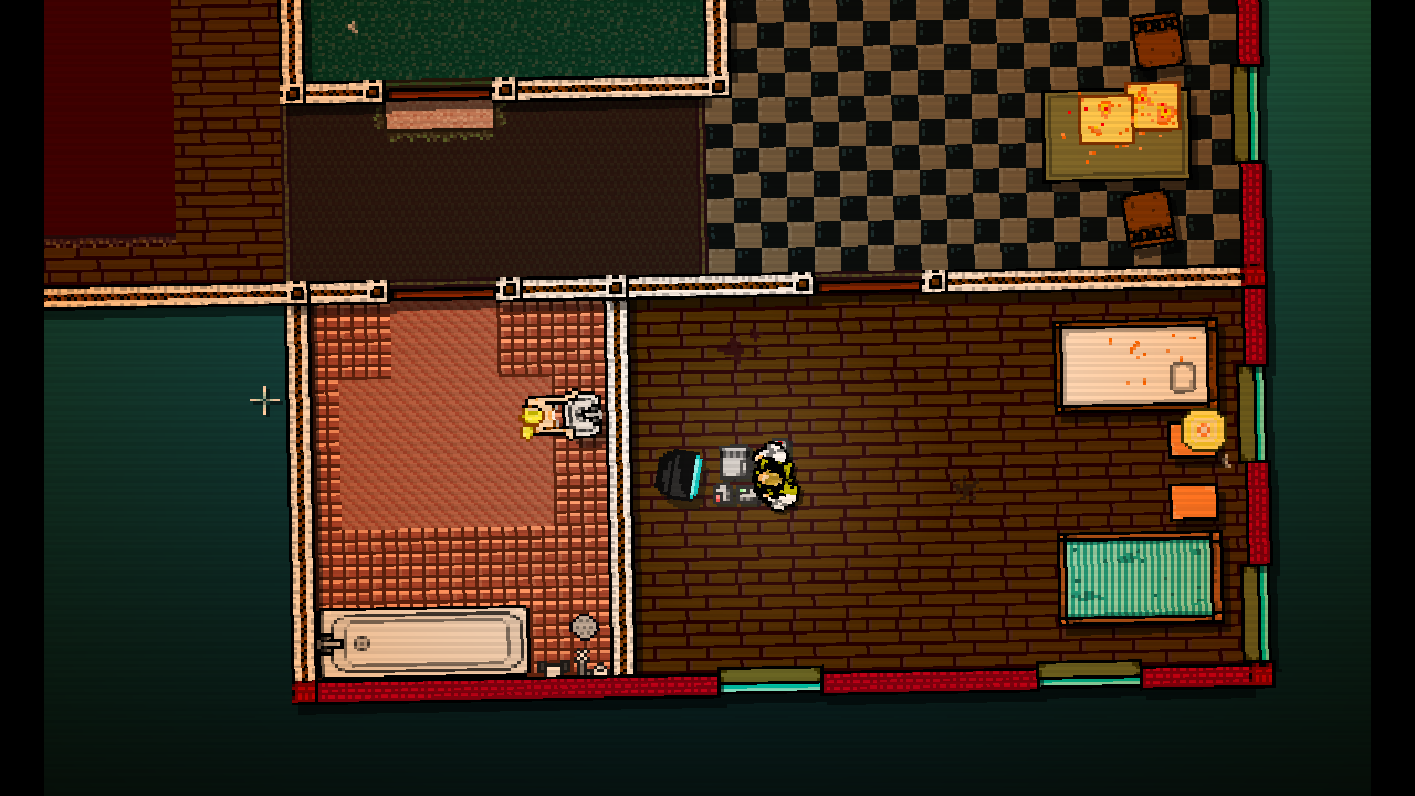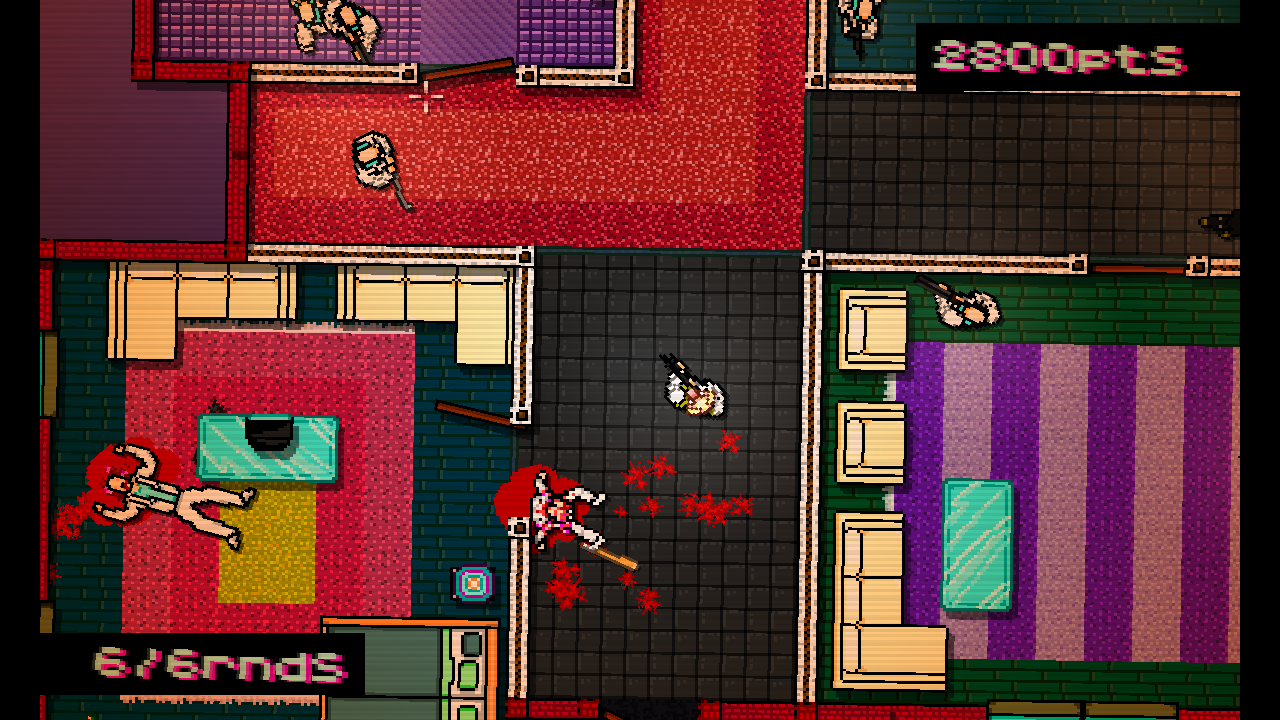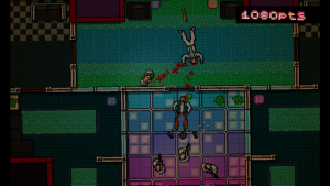 If this sounds slightly sickening, then it’s relevant to mention that the second unique point of the aesthetics is the gore. Oh god, so much exquisite gore. Whether it’s your body or the bodies of countless mobsters you create, the results are shockingly realistic despite the retro graphics. Blunt tools can cause broken necks, pools of blood leaking out of heads, or even smashed skulls with all the brainy bits flying out. Bladed weapons equals ripped bodies with exposed entrails, decapitated heads, or entirely bisected torsos. Guns lead to lots of bullet holes and missing limbs or heads thanks to concentrated shotgun fire. Even unarmed, your executions are merciless as you repeatedly punch or slam downed mobsters’ heads on the floor until they’re reduced to bloody chunks. If they slump against a wall, you can quickly kill them with a single head-crushing kick. This game is violent, dirty, filthy, and it just may make you feel a bit sick to cause so much wanton murder, which is likely what the creators were going for. The combination of druggish perspective and visceral death may be a put-off to some, but it’s also hard to argue the outstanding efficacy of the visual tone, as nothing else looks quite like it and never will resemble it: unless cactus has a potential sequel in mind.