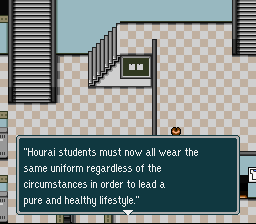 Some may compare this game to Earthbound, seeing the delirious scenario and modern setting. They wouldn’t be entirely wrong, as Hourai Gakuen no Bouken, more than its atypical universe, shares with it classical RPG gameplay and first-person battles. The progression is pretty different, though. It’s based on the school campus’s map, with each of its parts constituting “villages” of some sort, and to which the player will be required to come back regularly to use the services housed in the main buildings. The limits of the world map will widen as the chapters that lead us through the school year unfold, and more exotic and less “academic” regions will gradually make their apparition.