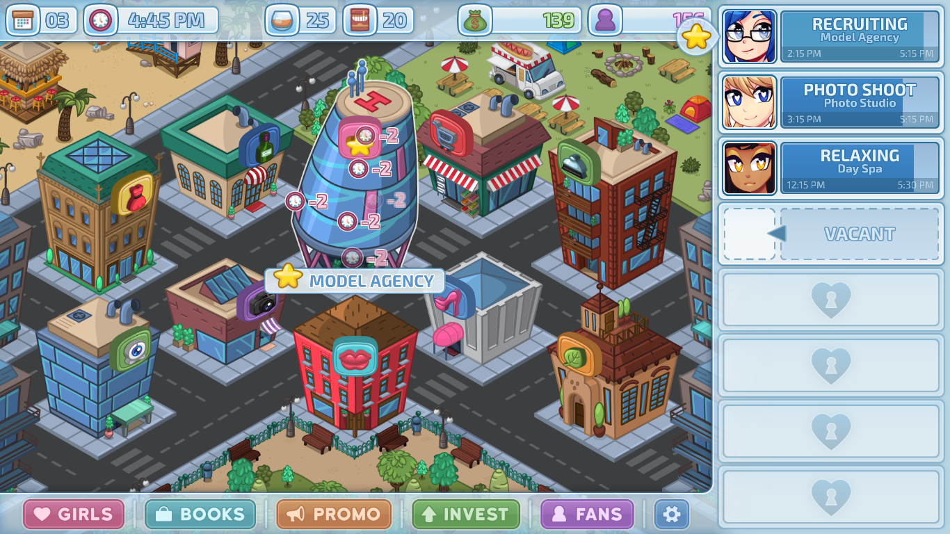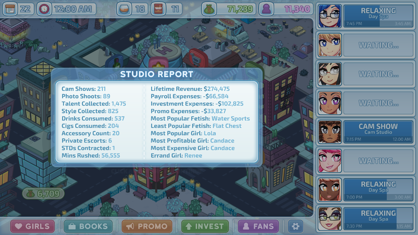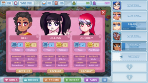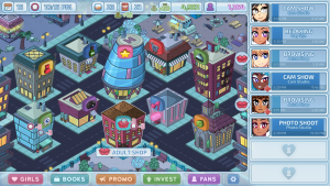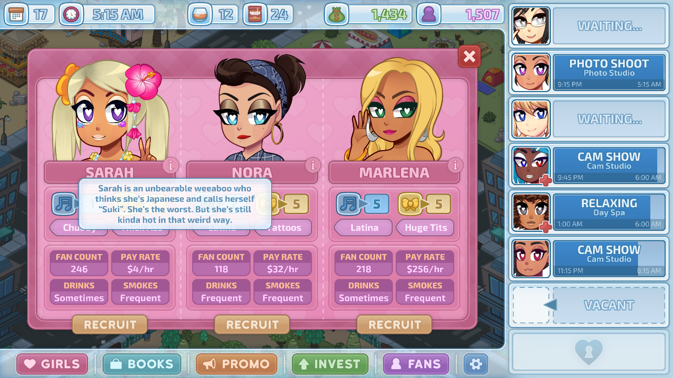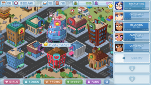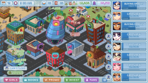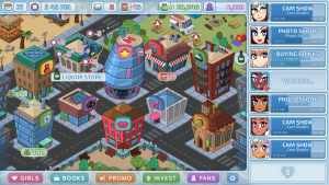 Of course, there’s a lot of complications. First, some girls smoke or drink, and while they tire out slower than others, they won’t do anything if you run out of cigarettes or alcohol. Thus, you have to keep stocked up at the two different stores on the map. When a girl gets too stressed to work, they have to spend some time at the spa to unwind. As you earn more money and fans, you’ll eventually be able to send girls out as escorts for far faster payouts, but this comes with risk. The other areas on the map are the agency where you can send your staff to recruit girls, and the “adult” store where one of your staff can pick up a random item.