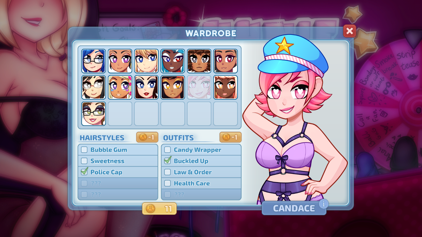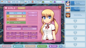 The game starts with Kyu, the ever obnoxious dudebro fairy girl of the last game, insulting you (because as established, she is Anonymous with a single form) and putting you in charge of running a cam show enterprise for twenty-two days, in which time you must gain as many fans as possible to earn trophies, plus coins from money earned. To do so, you have to scout and hire girls into your business (with the main set all returning alongside new, more stereotypical characters). You earn money per show based on how many fans the girl involved has, along with her talent level. To get more fans, you have to stage photo shoots, which adds fans based on the girl’s fashion level. Talent can be raised at the local strip club, and fashion is raised at the mall.