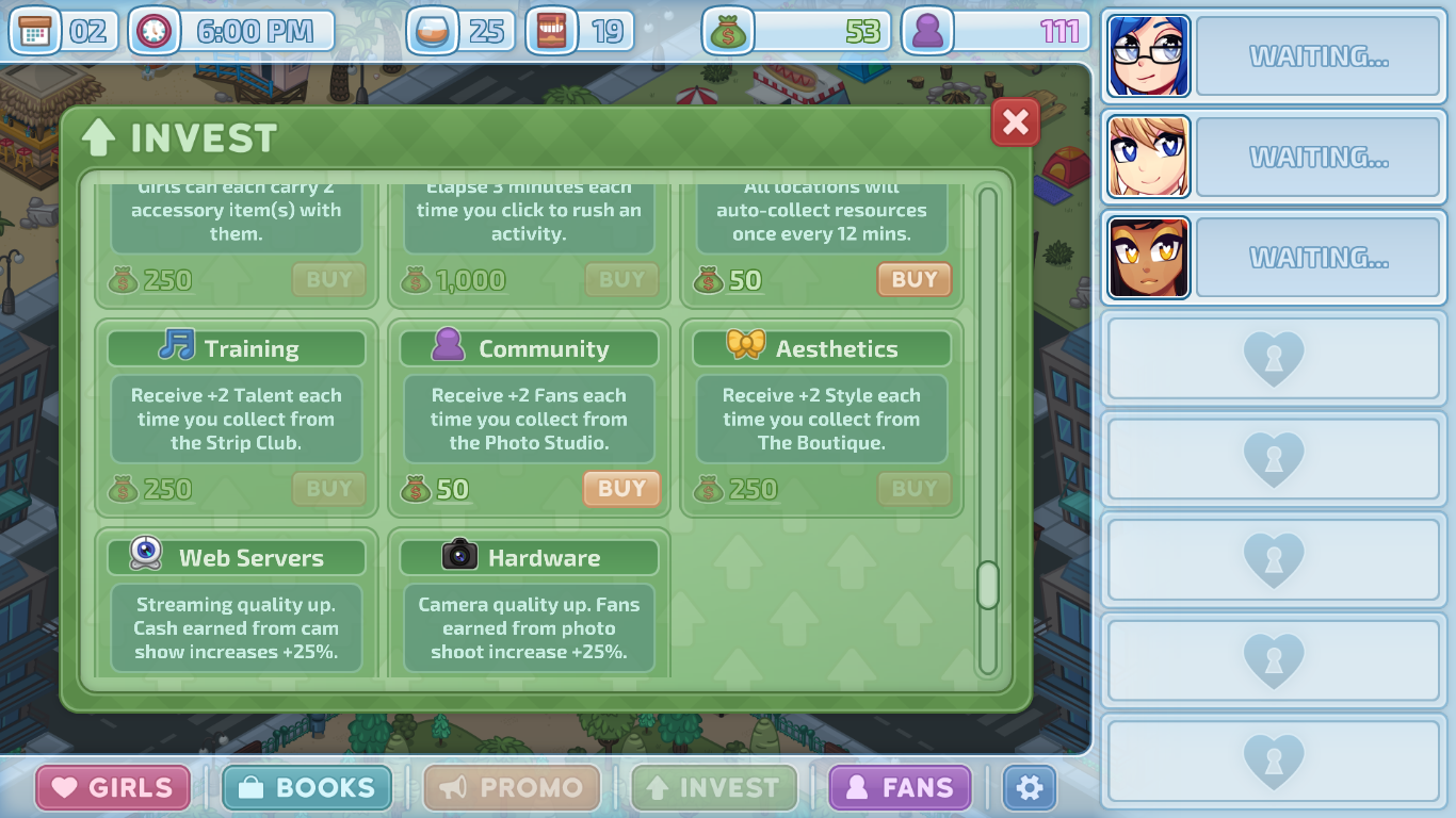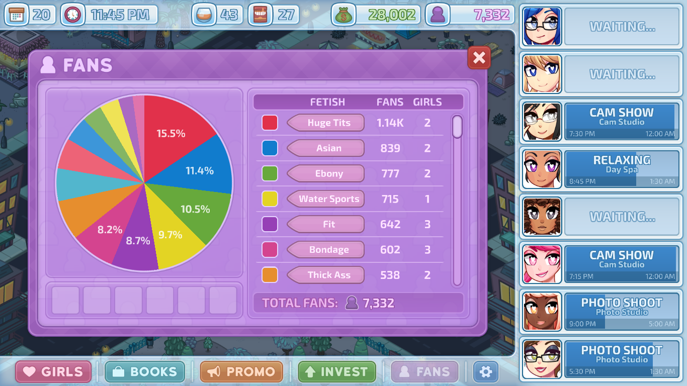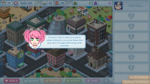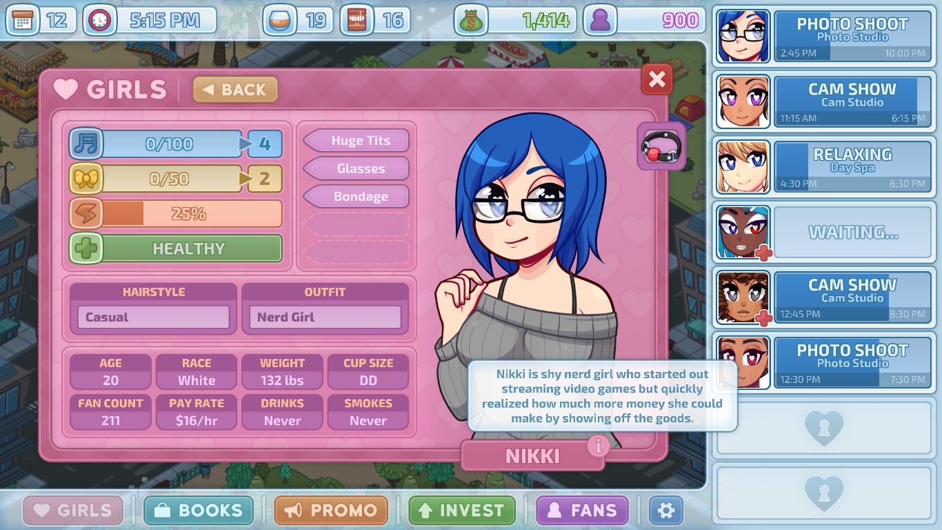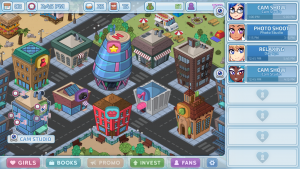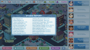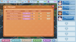 Items are important, because most add a different fetish to a girl’s appeal. Fans expect different fetishes, so different girls will get different pay outs based on fetishes. Focusing on fetishes and growing a broad staff with some reoccurring major fetishes can net you a lot of money. You can also increase each girl’s fanbase faster through buying ads, which acts far faster and much more effective than photo shoots. Along the way, you can also get items that allow staff to work longer or carry more stock from smoking or alcohol shops, buy upgrades that allow you to gather resources faster or hurry staff along by clicking on occupied areas (or you can simply hold a mouse button, a hugely welcome addition), and check your books and keep track of your employee’s salaries. Each girl has an hourly rate that increases as they gain more talent or fashion, and there’s a payout at the end of the day at midnight. If you hit the red and are still in it the next night, you lose, but as long as you get back in the green before then, you’re fine.