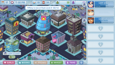 Items are important, because most add a different fetish to a girl’s appeal. Fans expect different fetishes, so different girls will get different pay outs based on fetishes. Focusing on fetishes and growing a broad staff with some reoccurring major fetishes can net you a lot of money. You can also increase each girl’s fanbase faster through buying ads, which acts far faster and much more effective than photo shoots. Along the way, you can also get items that allow staff to work longer or carry more stock from smoking or alcohol shops, buy upgrades that allow you to gather resources faster or hurry staff along by clicking on occupied areas (or you can simply hold a mouse button, a hugely welcome addition), and check your books and keep track of your employee’s salaries. Each girl has an hourly rate that increases as they gain more talent or fashion, and there’s a payout at the end of the day at midnight. If you hit the red and are still in it the next night, you lose, but as long as you get back in the green before then, you’re fine.