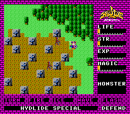 Hydlide is quite difficult, though technically not too much harder than The Legend of Zelda for the NES without clues. Some of the quests are simple – in order to get the lamp to see underground, you need to defeat the vampire, but before you can even touch him, you need to find the cross. Other puzzles are much more obscure – you need to burn a tree to get into Varalys Castle, for instance, or destroy a stone to drain a lake and kill a dragon. Since Fairyland is a pretty small world, if you take your time and try poking into every nook and cranny, it’s not too hard to figure some of the puzzles out. Some enemies like the twin wizards and the aforementioned water dragon require a bit more thought and effort to defeat. The translation work is confusing on one item in particular – the “Fake Medicine” which acts as a one-shot auto revive, and is needed to beat the last boss.