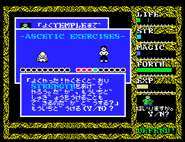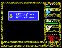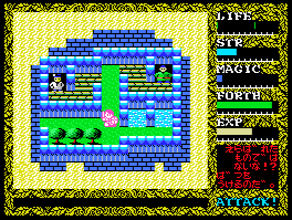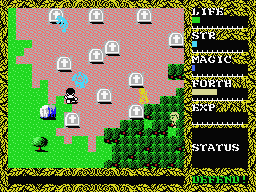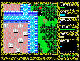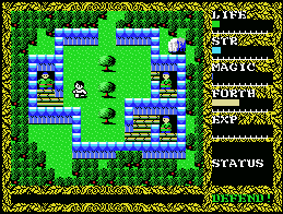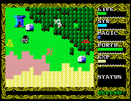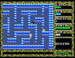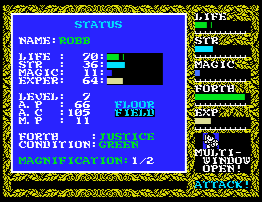 The game first introduces the mortality system found later in Hydlide III. Your character can be aligned with Justice, Normal, or Evil. Like in the next sequel, you lose morality by hurting good monsters and gain it by fighting only evil ones. The distinction between good and evil monsters is a lot tougher in this game, so you can find your morality (labeled FORTH, probably for Forthrightness) dropping quickly if you are not selective in what you attack. For the most part, if it’s human, you’re best off not attacking it. Unlike in Hydlide III, where morality only plays a role in taking out one of the bosses, being evil causes good monsters and townsfolk to ignore you. This in turn denies you clues, equipment, and training.