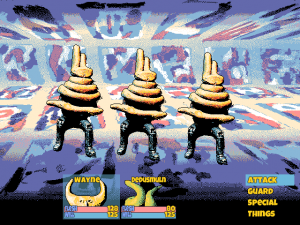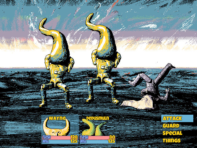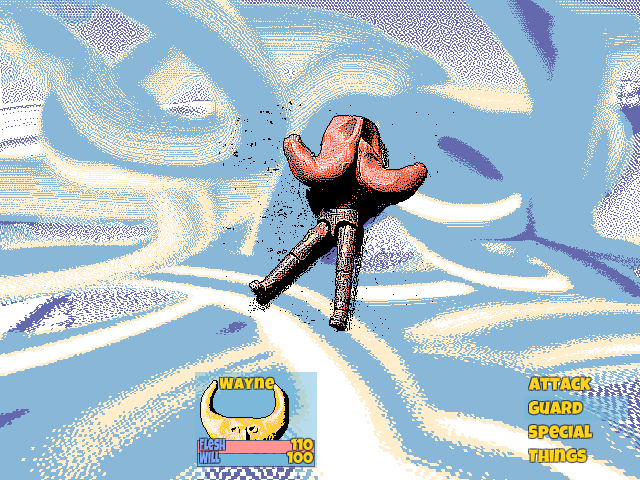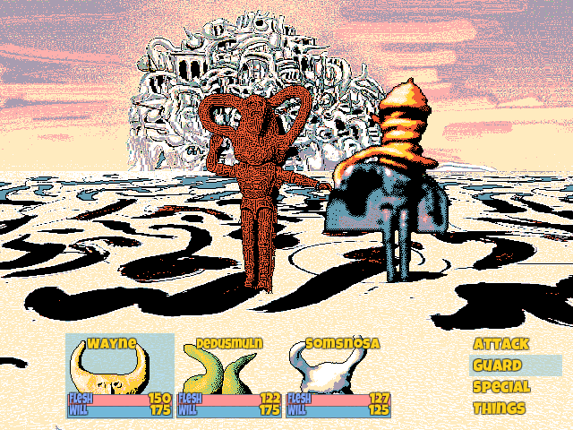 The atmosphere emanates a pervasive yet modest laziness. Advertised as “a recreational game with light JRPG elements”, Hylics is just that. During the span of your playthrough, you recruit several party members who tag along in fairly standard yet engaging combat. The protagonists (especially Wayne) have an aesthetically compelling design but are memorable only for their design alone. Personalities are absent: if every line of dialogue they spoke was taken and presented at-random, there’d be no way to tell them apart. This is why there’s plentiful fanart of them, and virtually no other fan media for Hylics.