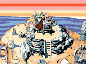 It’s impossible to talk about Hylics without immediately addressing its visuals. On their basis alone the game can well be assumed as some kind of premiere subverter, a definitive example given when one proclaims “yes, games areart!”. It’s hard not to be amazed – they’re gorgeous, with a psychedelic style that ranges from rotoscope, to claymation, to digital, all of which blend together seamlessly to make something utterly unique to Hylics and Hylics only.