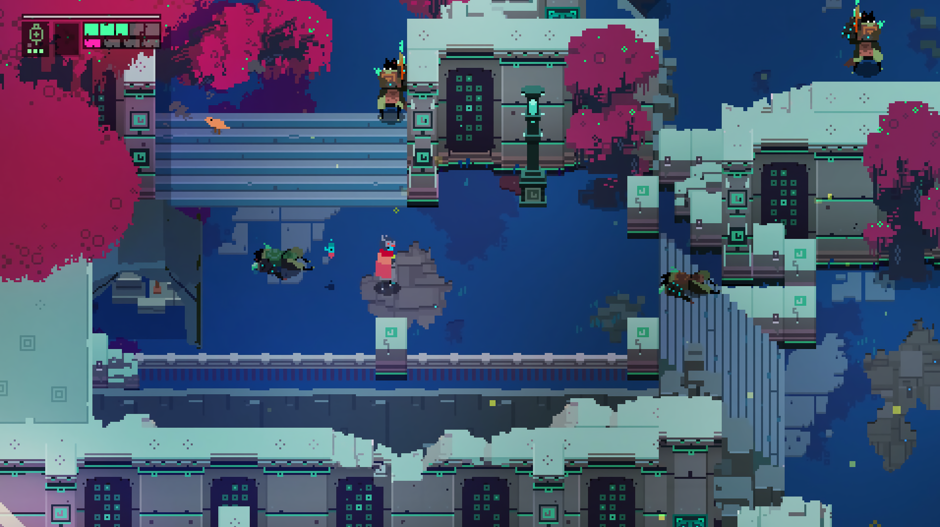 Still, the game in general is more difficult than most action-RPGs. In titles like Zelda, Ys, or any number of classic 8/16-bit games, the combat with general enemies is simple but fun, with the challenge mostly coming from the boss battles. Hyper Light Drifter is much more demanding, taking some inspiration from From Software’s Soulsbourne (Dark Souls and Bloodborne) series. Your primary weapon is your sword, which is fast but still requires deliberate timing. The enemies are just as fast as you are, and are barely stunned by your attacks, so you can’t just mash the attack button and expect to win. You also have a variety of guns, which are tough to aim, but can be used in conjunction with your sword slashes to inflict additional damage or attack from a distance. You can only shoot a few rounds at once, but they’re automatically replenished when you kill enemies. You can also dash, which is essential. Much of the combat involves chipping away at an enemy’s health while dodging their attacks, and often trying to defend yourself from multiple foes at once. Most enemies can be killed in two or three hits, but when they gang up on you, especially if one of them uses a projectile weapon, it can be hectic to engage everyone while avoiding being attacked yourself.