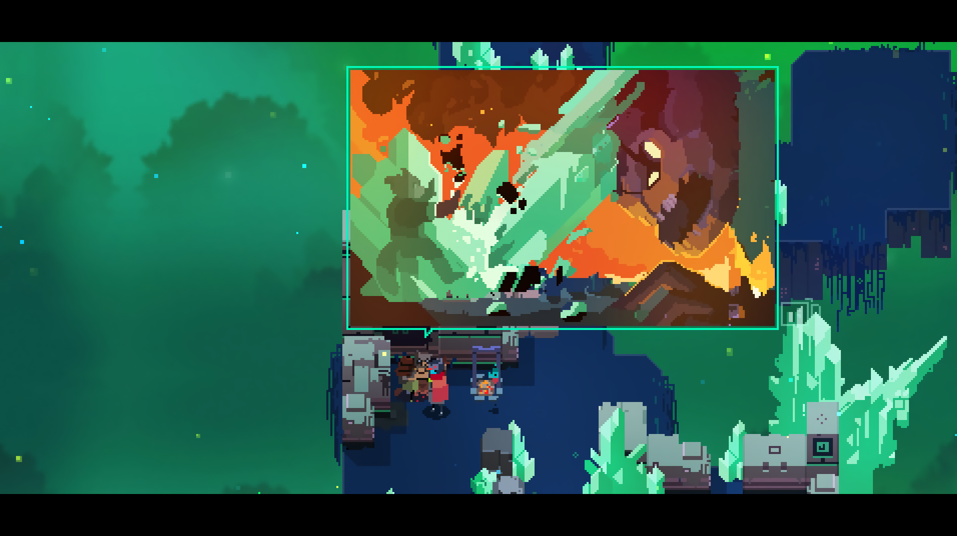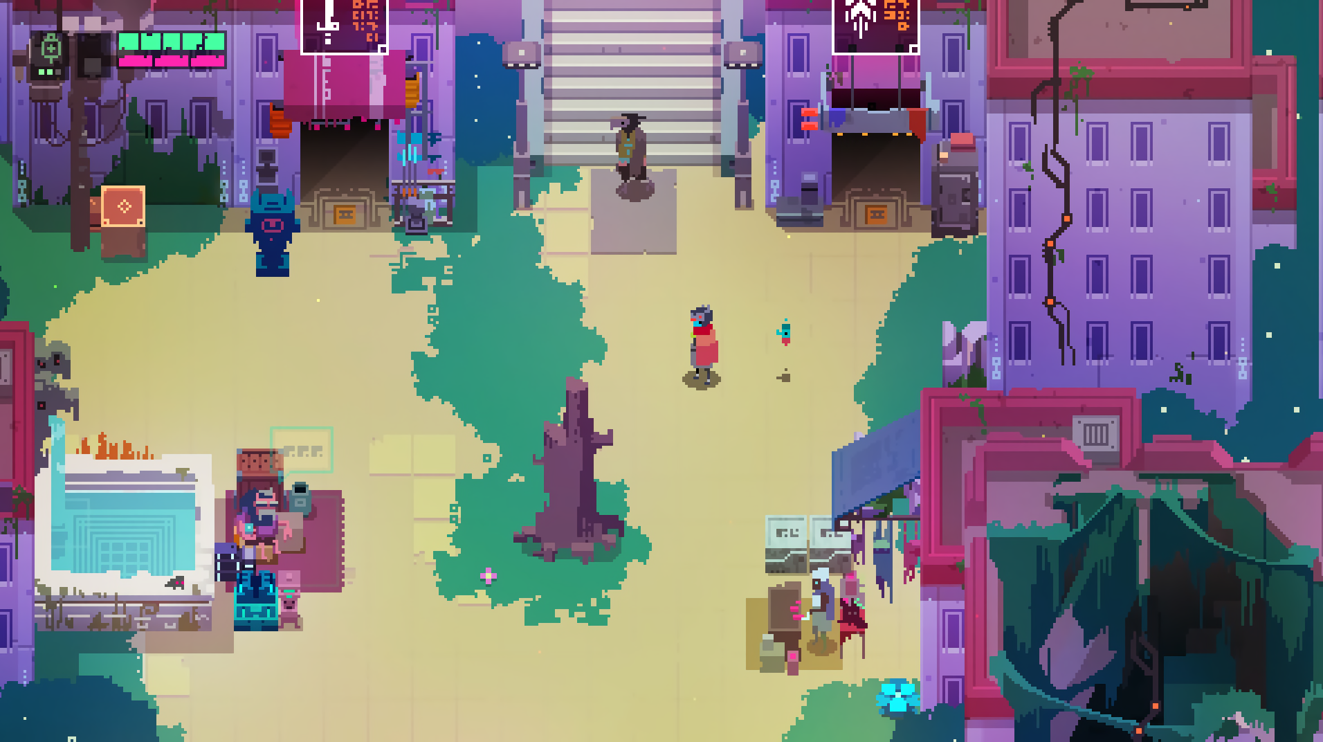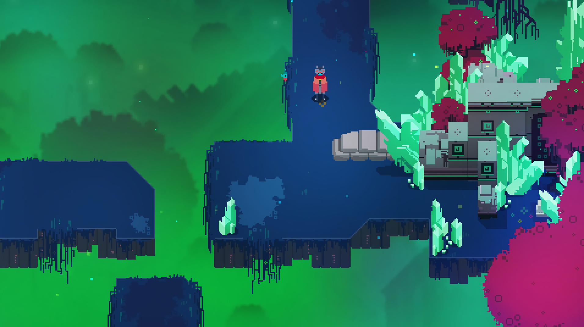 Beyond its solid combat system, Hyper Light Drifter‘s other strength lies in its world design, and more importantly, its aesthetics. It uses high resolution pixel artwork but isn’t interested in replicating the retro style of most other indie games. Instead, it’s deliberately jagged but exceptionally well animated, with its closest comparison being the likes of Capybara’s Sword and Sworcery or Super Time Force, but even then it looks drastically different. Most areas are dominated by simple color schemes. For example, the western route features dark green grass, red skies, and light green crystals. The tiles radiate with all colors of the spectrum, though, and the visual designers simply love sunbeams, which are placed pretty regularly. This type of shading gives the game a much darker feel than many 2D pixel-based games, even though it relies on primarily colors.