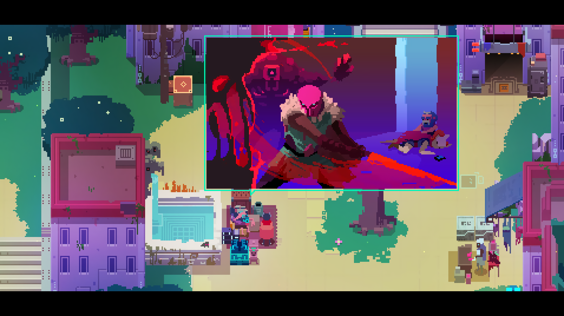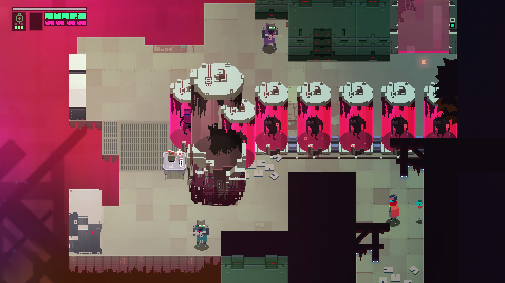 It’s not just the general color scheme that gives Hyper Light Drifter its identity, but the skill and care that each area is rendered with. The overworld is filled with incredible details, most of which flesh out the backstory. Granted, there’s not much to the story other than “there were evil giants around the land, something killed them, and now their corpses are everywhere”, but it still creates a landscape that feels rich and alive despite being a destroyed wasteland. It gets even weirder when you start exploring underground labs and wander across all of the biological equipment used to create these giants, particularly the room that has two gigantic eyes, floating in red liquid, staring at you. This is the sort of game where it’s hard to not to wander through every room and take screenshots of everything, then flip through them later on as mementos from your journey through this strange and enthralling world.