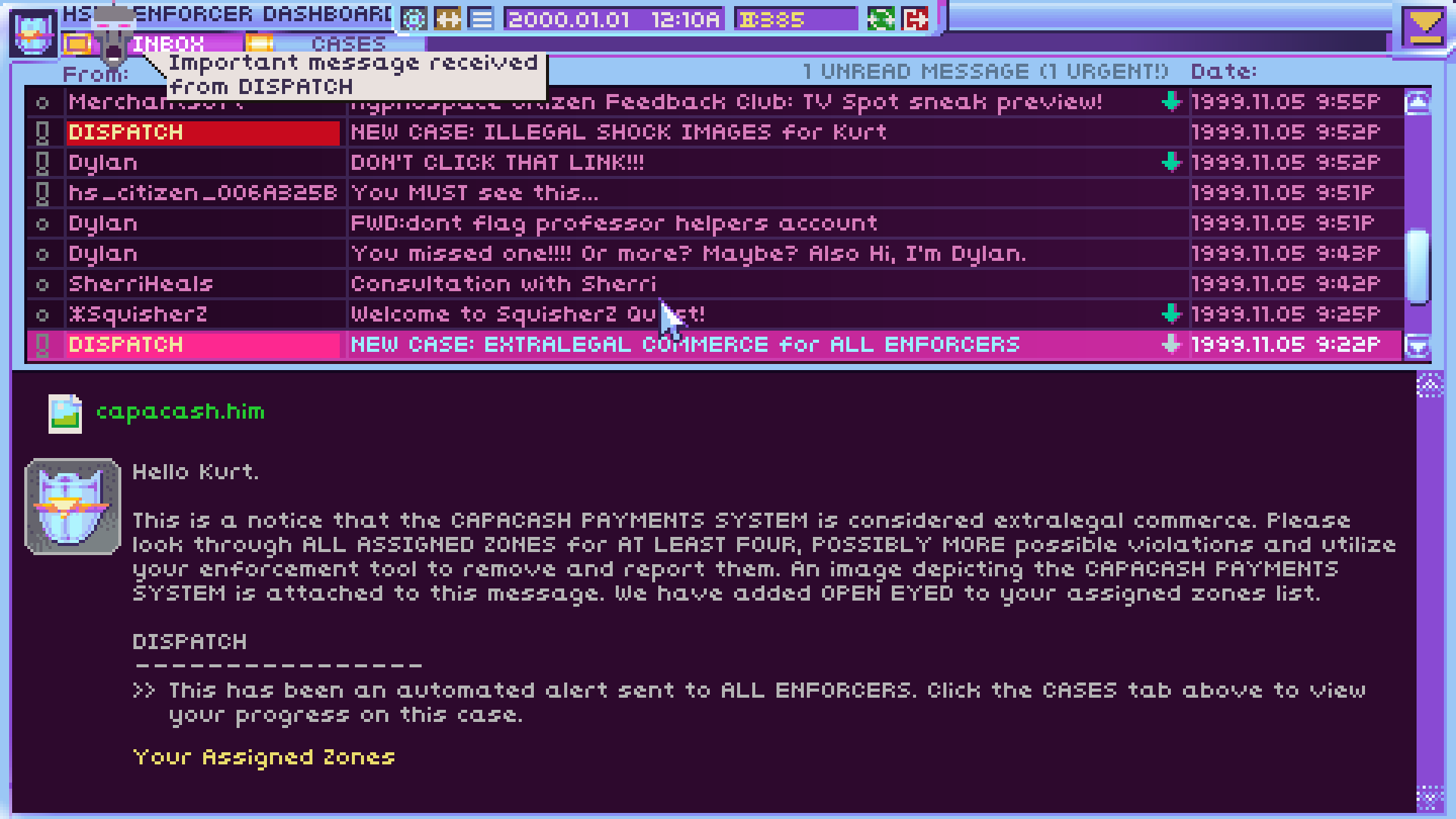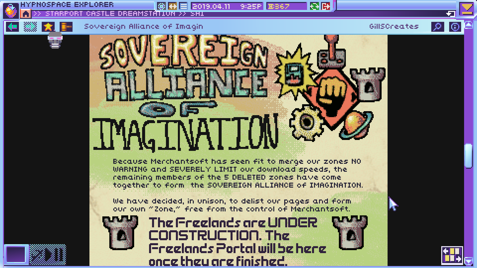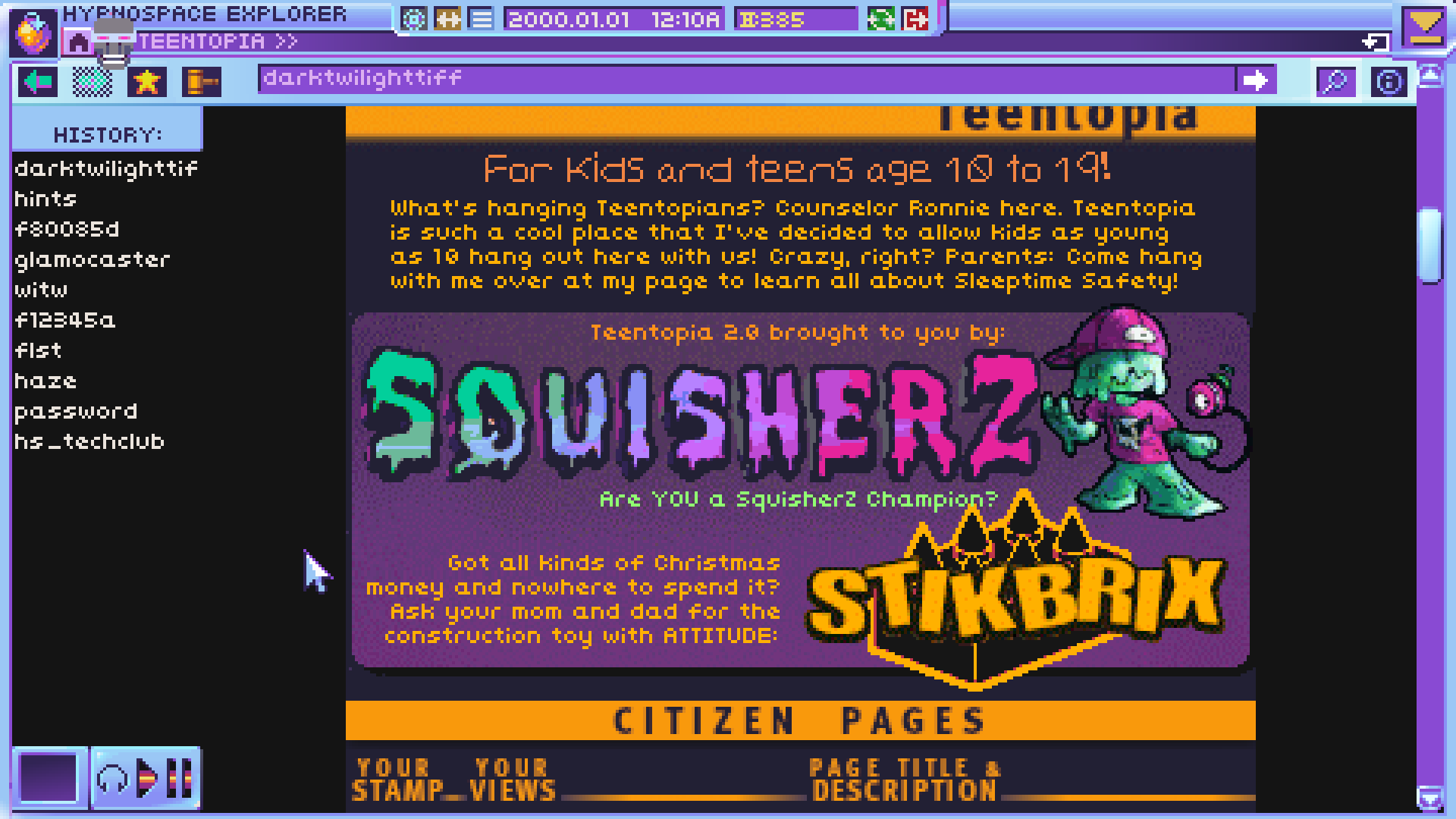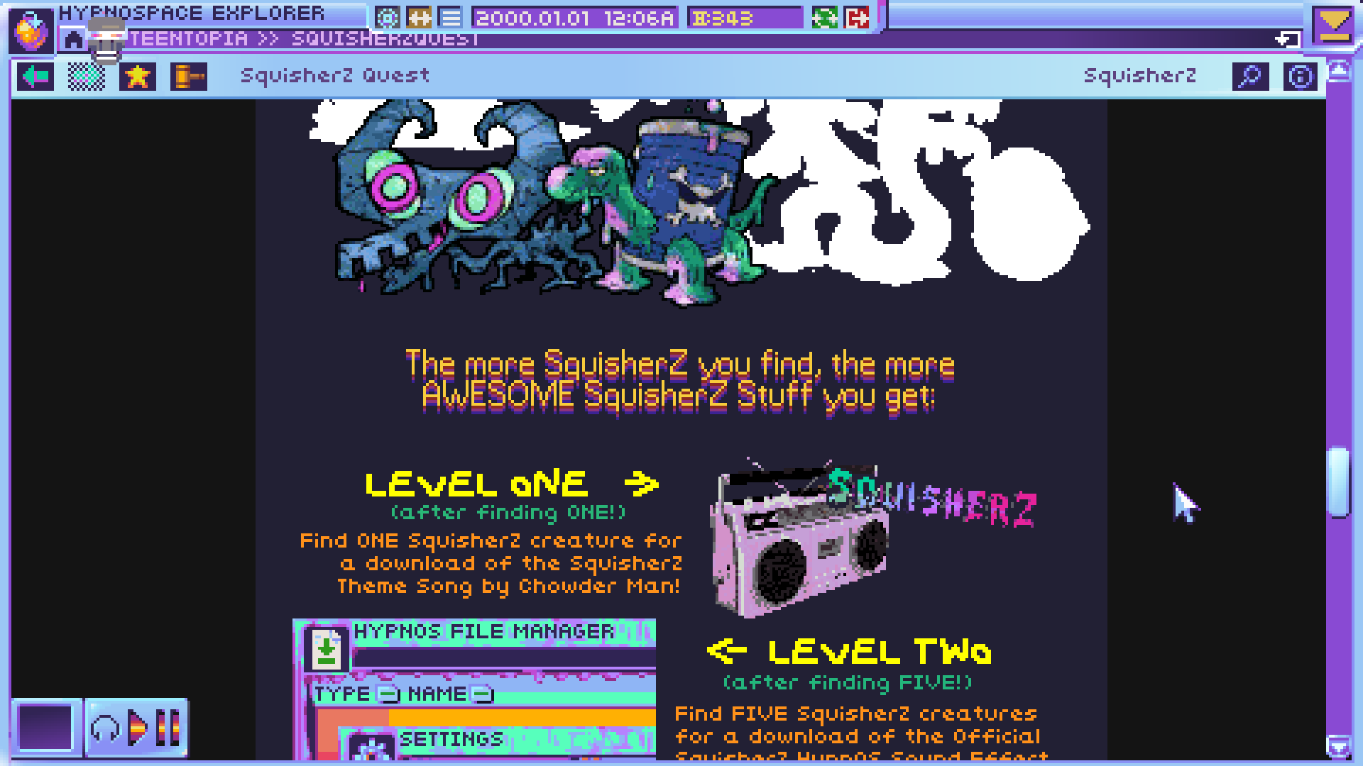 It’s a good while before the “plot” actually kicks in, as the company gets ready for the Year 2000 switchover, but altogether, if you break down all of the steps you need to beat the game, Hypnospace Outlaw is not very long. But actually “beating” it is only part of the experience – the real fun is being immersed in it. Behind each of the pages is an individual, whose identity manifests itself in their creation – their hobbies, politics, religion, taste in music, and so forth, much of it achingly earnest but presented without derision. Some of them know each other in real life too, as you can see the juvenile high school drama in the first area you need to patrol, dubbed “Teentopia”. Many users aren’t happy with how Hypnospace is being run, not only in your role in keeping clean (the schoolteacher whose page you scrub of the aforementioned cartoon character begins a patriotic crusade against your actions), but in various technical and organizational issues. A bunch of users “leave” the main area in favor of an independent section called “Freelands”, which crows about the freedom that anyone can do what they want, but is fact ruled by the arbitrary whims of one of the admins. There’s also a sidequest to hunt down hidden stickers called Squisherz, which are sort of like NeoPets, and even a “secret” file sharing network you can infiltrate.