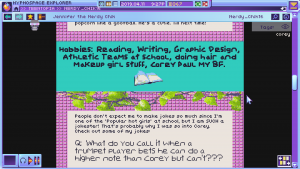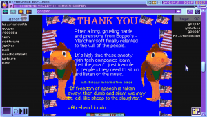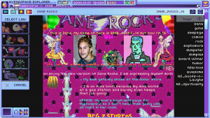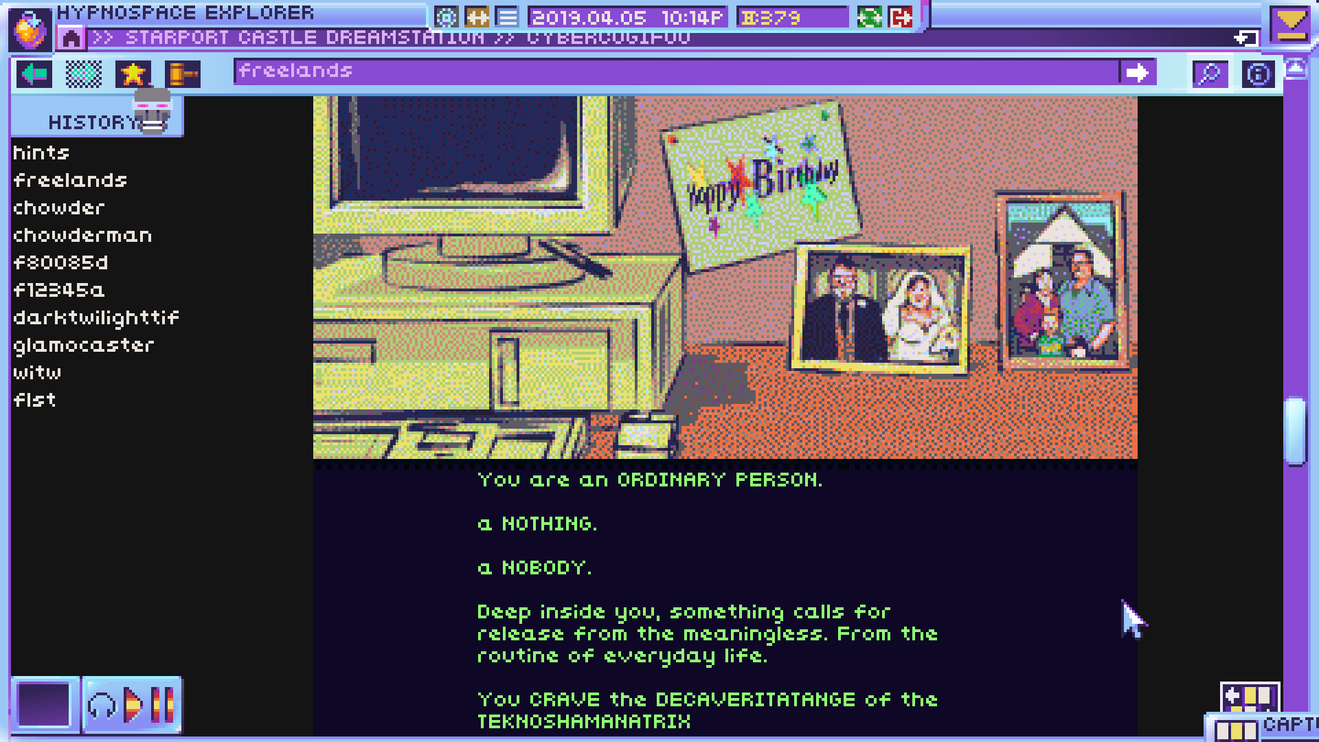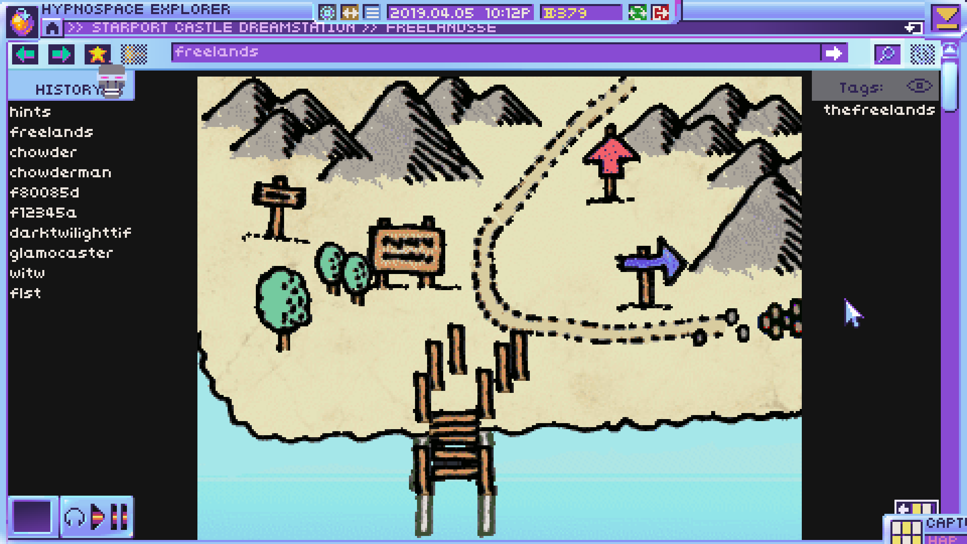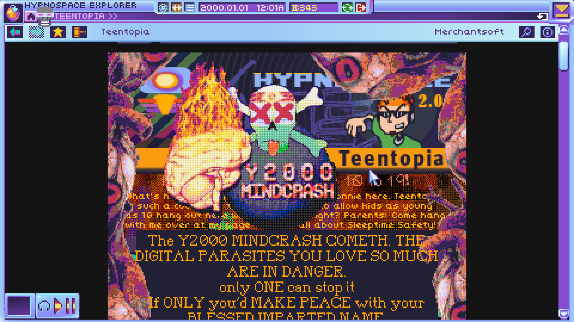It’s a good while before the “plot” actually kicks in, as the company gets ready for the Year 2000 switchover, but altogether, if you break down all of the steps you need to beat the game, Hypnospace Outlaw is not very long. But actually “beating” it is only part of the experience – the real fun is being immersed in it. Behind each of the pages is an individual, whose identity manifests itself in their creation – their hobbies, politics, religion, taste in music, and so forth, much of it achingly earnest but presented without derision. Some of them know each other in real life too, as you can see the juvenile high school drama in the first area you need to patrol, dubbed “Teentopia”. Many users aren’t happy with how Hypnospace is being run, not only in your role in keeping clean (the schoolteacher whose page you scrub of the aforementioned cartoon character begins a patriotic crusade against your actions), but in various technical and organizational issues. A bunch of users “leave” the main area in favor of an independent section called “Freelands”, which crows about the freedom that anyone can do what they want, but is fact ruled by the arbitrary whims of one of the admins. There’s also a sidequest to hunt down hidden stickers called Squisherz, which are sort of like NeoPets, and even a “secret” file sharing network you can infiltrate.