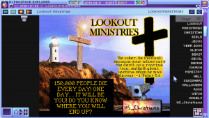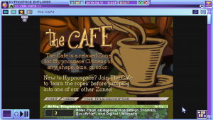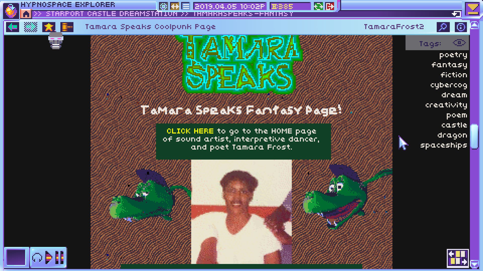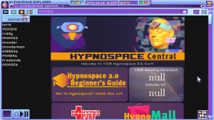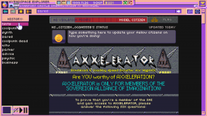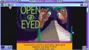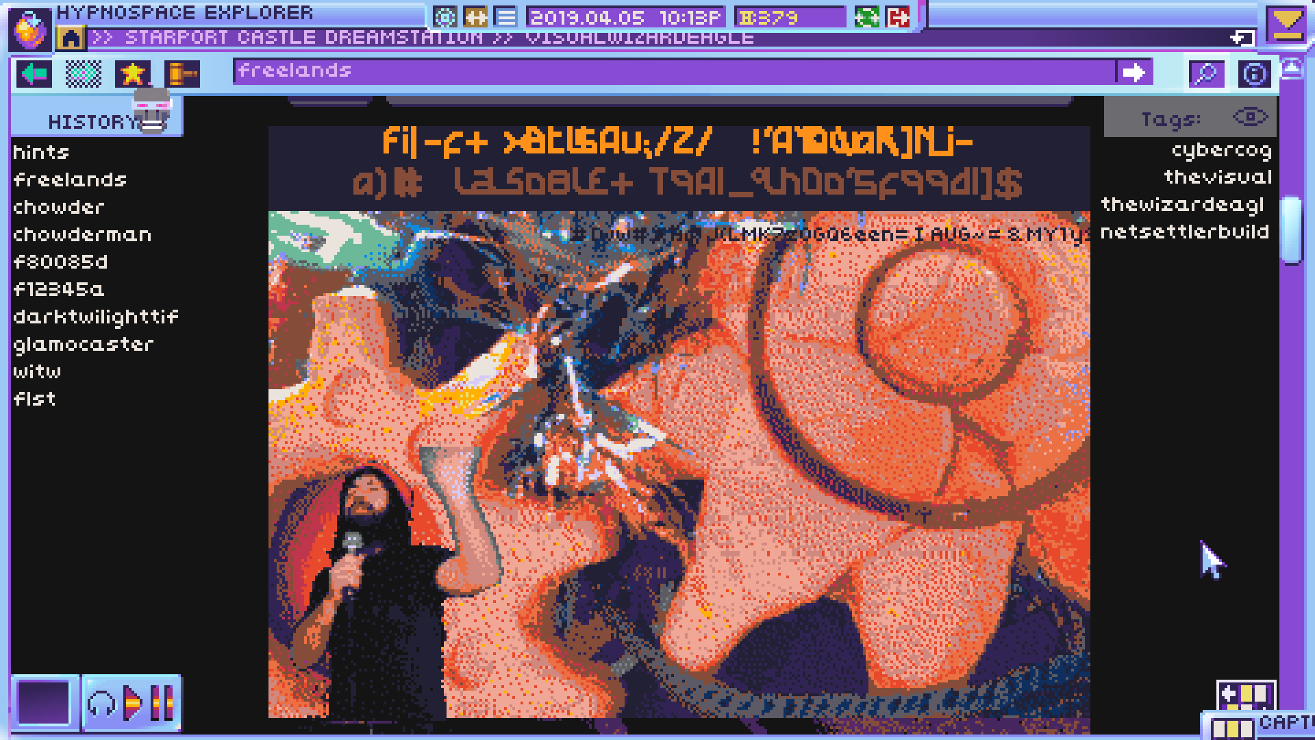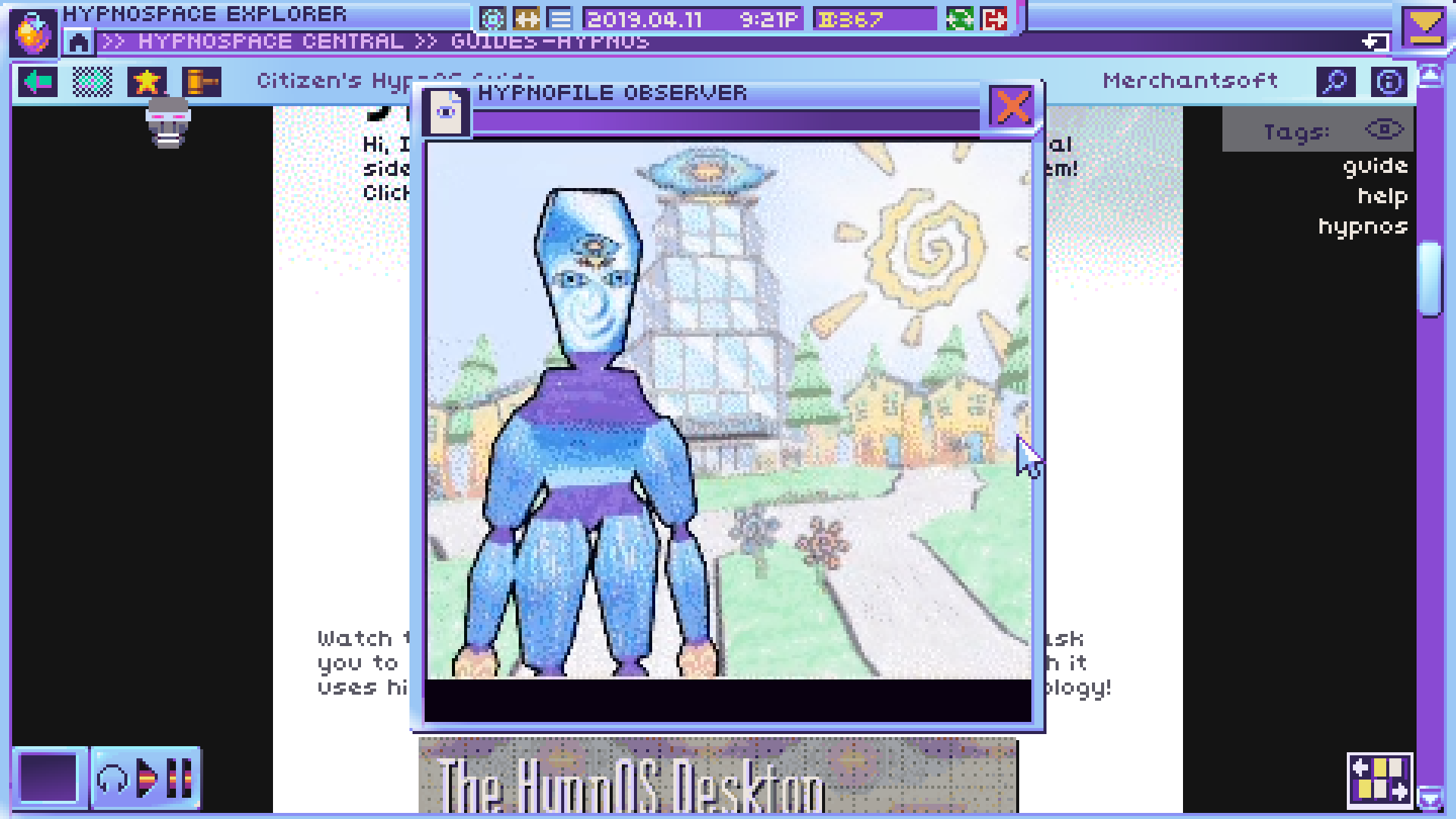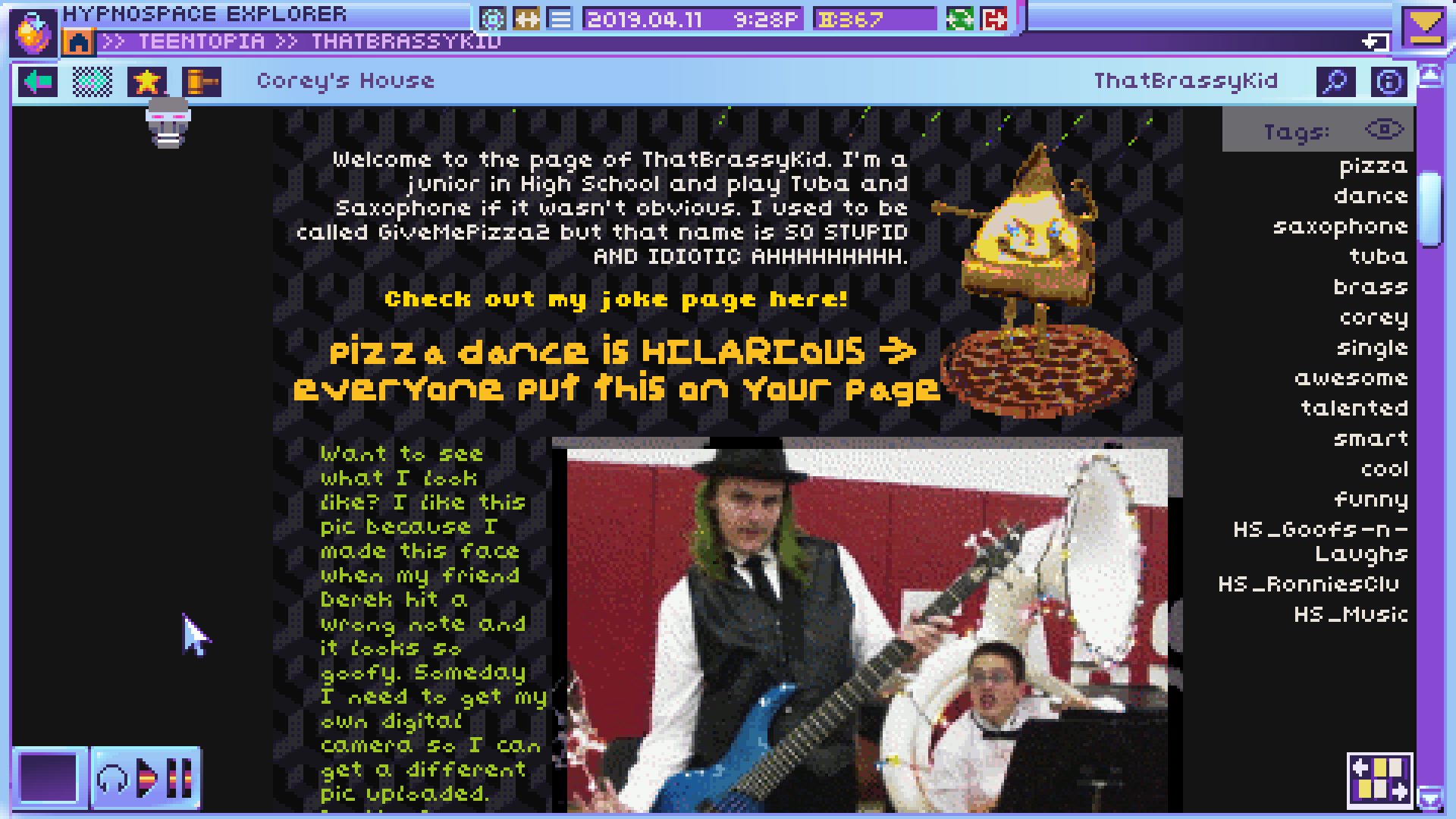 This isn’t quite the same 1990s, rather an alternate and reimagined one. The entirety of the game’s cyberspace is contained inside of dream virtual reality helmets, experienced while users are asleep, and is a mishmash of eras and technologies. The setup is akin to America Online, where there are different “zones” of various interests, while the user created page designs are a combination of the average Angelfire/Geocities/MySpace site. Each page is given a set of tags, which you can use to search for various topics, plus each are categorized into major themes similar to the webrings of old. There’s also an introduction area where you click around first-person areas similar to adventure games like Myst, which was a common theme in 90s multimedia PCs.