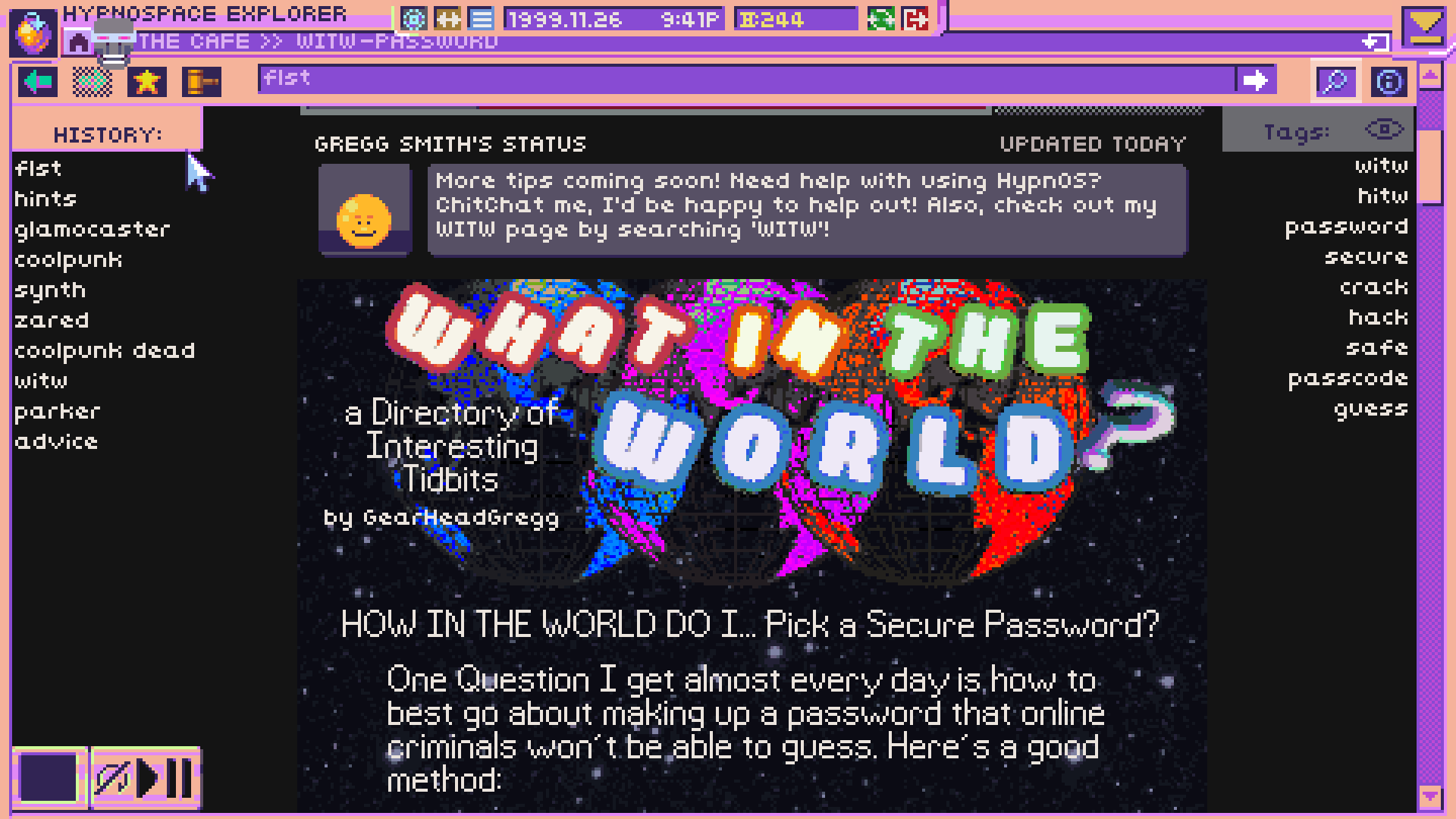 There’s a joy in just surfing this alternate, halfway-nostalgic web, but when you actually try to solve the mystery is where Hypnospace Outlaw becomes rather frustrating. The first set of tasks is pretty simple since you can search related tags, or just browse around a fairly small area to find stuff that’s obviously against the rules. But then the world very quickly opens up, and your tasks become much more abstract. Like many adventure games, in order to proceed, you really need to know what the narrative designers were thinking and follow their logic. But since it’s so wide and open-ended, it’s very easy to overlook or misinterpret clues, and end up wandering in circles. Sometimes it’s reasonably clear, like doing a bit of minor social engineering to crack a password, but other times you need to do some lateral thinking to even begin to make any progress, and it can be incredibly vague. There is a fourth wall-breaking hint area, but even that won’t tell you direct answers (most of the time). In some ways, this is an unavoidable effect of the “browse at your leisure” design, but some kind of stronger direction would’ve been nice.