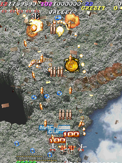 Lastly, and most importantly, is chaining medals. Medals can appear from ground targets (large enemies, buildings) via bombs, or dropped from airborne enemies. The airborne enemies’ drops are set on a fixed pattern of shot power-up, medal, shot power-up, medal, option, medal, which repeats four times, then one pattern of shot power-up, medal, large shot power-up, at which point the cycle restarts at the first small shot power-up. At the start of the game, medals have a base value of 100 points. Collecting all medals on screen will cause the next wave of medals to increase in value by 100 points. At a value of 1,000 points, the medals increase by 1,000 points after each wave, maxing out at 10,000 points. This process is called “medal chaining” and will continue so long as the player is sure to catch the last medal of each wave on the screen. Missing the last medal will cause the process to start over, with medals reverting back to their initial value of 100 points. In order for the value to increase, the screen must be empty of all medals. Also, Ibara employs a ・letter score” system, just like Battle Garegga and Armed Police Batrider what this means is that after 9 million points, rather than receiving 10 million points, the millions digit becomes a capital “A”, and if all 26 uppercase letters are used, the game will then move onto lowercase letters. These scores are read as “(letter) million points”.