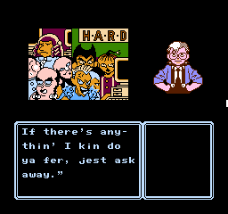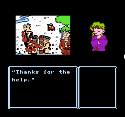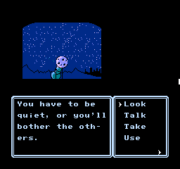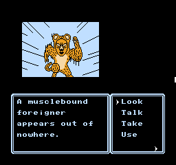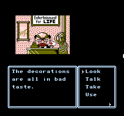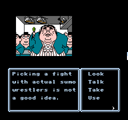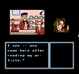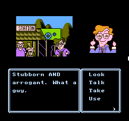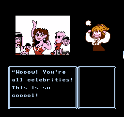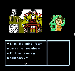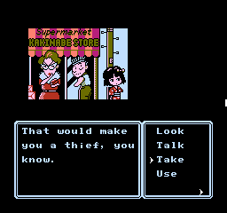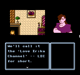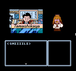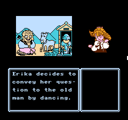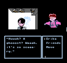 This is further enhanced by the adorable presentation. Although the screen is mostly taken up by black borders and the command menu in usual Famicom adventure fashion, the backgrounds are colorful and characters are presented through charmingly drawn sprites that capture their personalities, with Erika’s many sprites for her moods and actions being a particular highlight. The music by Kiyohiro Sada and Tomoo Misato provides a lively soundtrack that compliments the cheery and upbeat mood of the adventure, featuring a handful of tunes that Erika sings at crucial moments accompanied by onscreen lyrics.
