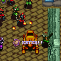 The gameplay is much the same as the original, including the rotating joystick allowing individual movement of the character’s upper and lower halves. There is the notable difference of unlimited ammo; bullets can be fired and grenades can be chucked indefinitely, as well as any other weapons you’re able to find. On the subject of other weapons, besides the bullet and grenade enhancements from the first game, there is a large bazooka which plows through enemies and hidden walls alike, a steel boomerang that can slice through opponents, and even a giant sword that can destroy enemies merely by touching them while somehow allowing you to still fire normal bullets. It’s fun to just keep turning the rotating joystick to keep swiveling around with the sword, sort of as if Link from The Legend of Zelda was stuck in a perpetual spin attack. There are no tanks on the alien planet, but every now and again, a suit of metal armor will pop out and allow the character who picks it up to take an extra hit. There’s also an eyeball item that allows you to detect items hidden within the scenery, much of which is destructible. You toss grenades (or fire the bazooka if you have it) to tear down walls and blocks to either get some items or blow a pathway through a geological formation. It can be advantageous to take hidden paths that you create, as you may notice a green tile that flies in out of nowhere and places itself on the ground. More of this in a bit.