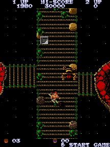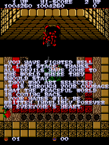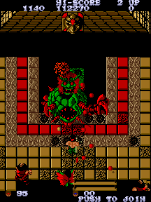 What’s particularly frustrating are these green tiles that fly out of nowhere like the Phantom Zone and perch on the ground, waiting for you to step near them. If so, they open up a chasm that ropes you into a tough fight against either a multi-headed flying dragon or the stone head that insulted you in the beginning of the game. A lot of these tiles pop up throughout the course of the game, oftentimes in the path of your ideal route. There’s no reward besides extra points for beating these bosses; these boss zones (which are entirely colored in a shade of red that will inflict harm upon your retinas) are outright traps that are far better off dodged. You are sometimes encouraged to blow a new path through rocks to avoid the tile, which can be frustrating to angle properly. The overall game is fairly long, made even longer if you keep falling into these things. Sometimes, it’s not easy to get around them, and many a player has declared profanities against the arcade screen because of them.