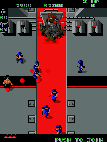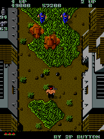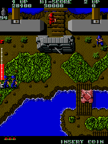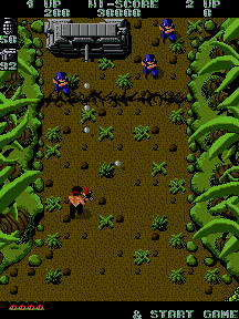 The graphics are nothing to write home about, but they did the job for the time. As with many of SNK’s early titles, the colors are generally drab and submissive. As the game takes place predominantly in the jungle, you’re going to be seeing a lot of green and brown in the landscape, broken by the occasional blue of a water body or the cold industrial gray of the area near the end of the game. The animation is okay, though it’s a bit odd to see the heroes swivel their upper bodies around independently due to the manual rotation. There’s not too much to say about the sound. The effects for the bullets and explosions aren’t really all that convincing, but it’s not expected to be high-tech around this time without any realistic sound samples. The music mostly comprises of one major tune that plays all throughout, which can get tiring, but it’s a neat piece of music nonetheless. It is broken up for the moments in the game where you come across an enemy blockade (considered to be something akin to a boss fight), where the music morphs into a tense piece that also sounds decent. Overall, it’s what one would expect from a mid-’80s arcade game.