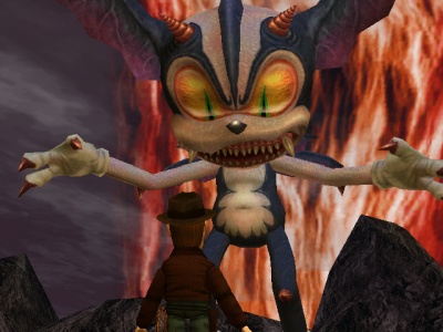 This episode introduces a new element as well: Many spots marked with the horror monitor are now story fragments of the described events, and one is actually supposed to not mark them in order to view the story. Most of the time in this mission is really just spent watching cutscenes, although it’s all so crazy it’s hard to mind. Combat is most bearable in this mission, since Cork gets a firearm from the start. The devil in toy hell is Zodick the Hellhog, who shows an uncanny resemblance with a popular SEGA mascot – he is defeated by shooting golden rings out of him and destroying them.