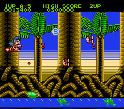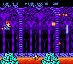 The Famicom port is much closer to the original arcade version, although it obviously doesn’t look as nice. However, again, it features different protagonists, allowing the player to choose between a male (“FOR BOYS”) and female (“FOR GIRLS”). Although there’s an option to change the difficulty, the female character is meant to be the easy mode, because she’s much more powerful, complete with a rapid fire weapon.