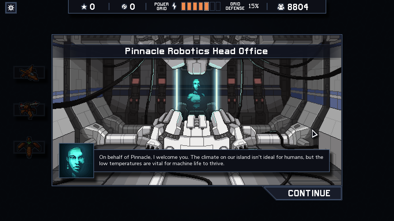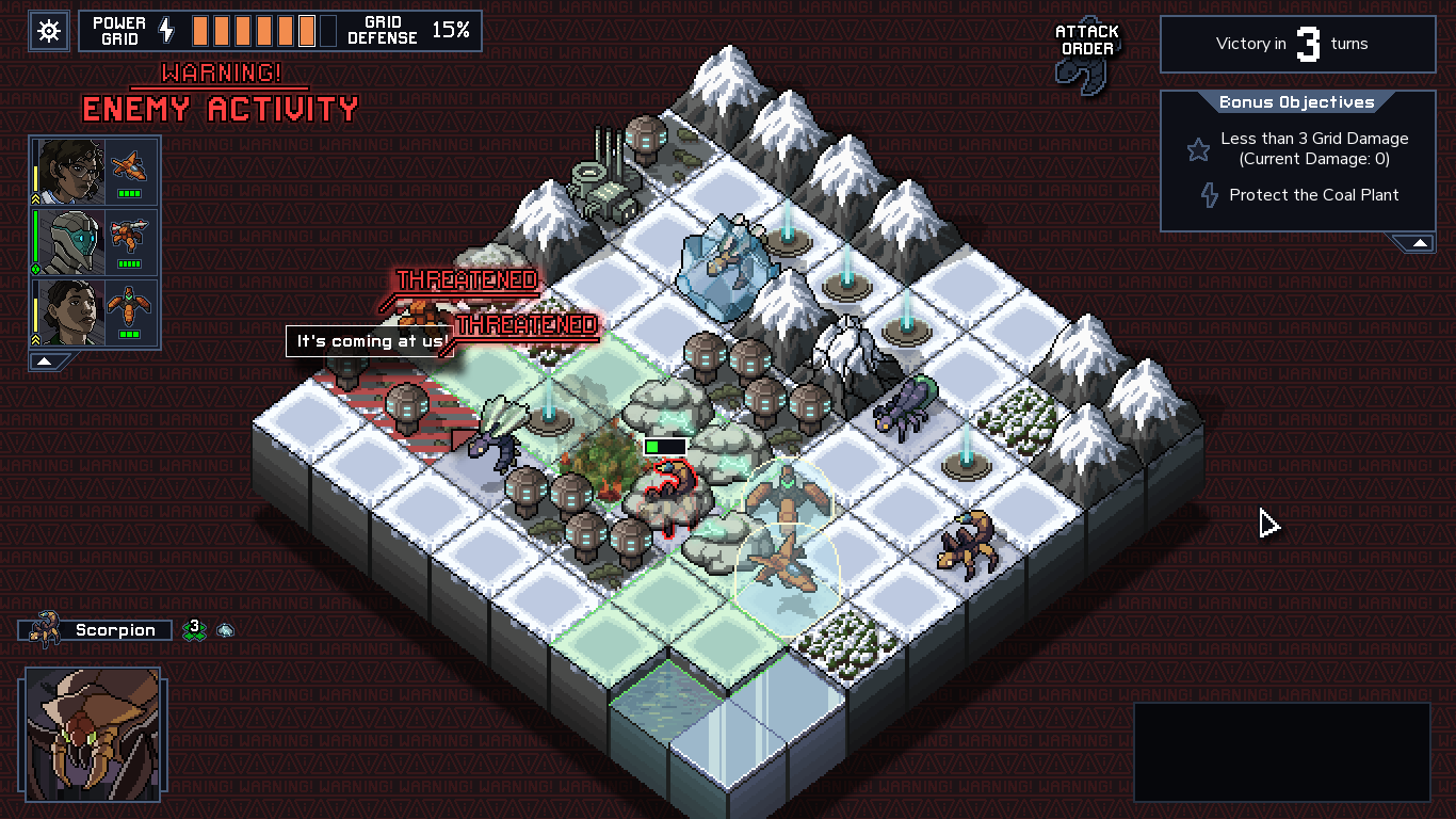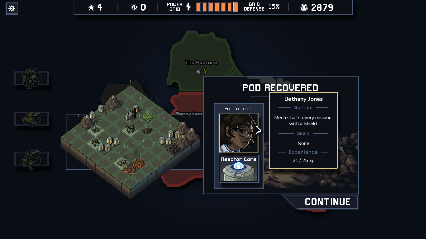 Into The Breach is designed so masterfully that just the basic gameplay loop overcomes every shortcoming (which are all mostly minor). You start a run, try to free two of four islands to get to the final mission or try and do as many as you can for a better score, fail, go back, pick up new mech sets and/or choose new pilots, and try again. Every fight plays out on a grid and ends automatically in a set number of turns as you try to survive and accomplish sub goals for rewards. You instantly fail the whole run if you let the grid go down, which loses power every time a city or building is hit, rechargeable by protecting major power sources in some missions. Thus, you can’t live out your robot combat dreams, instead thinking through how to win in grim scenarios with as few losses as possible.