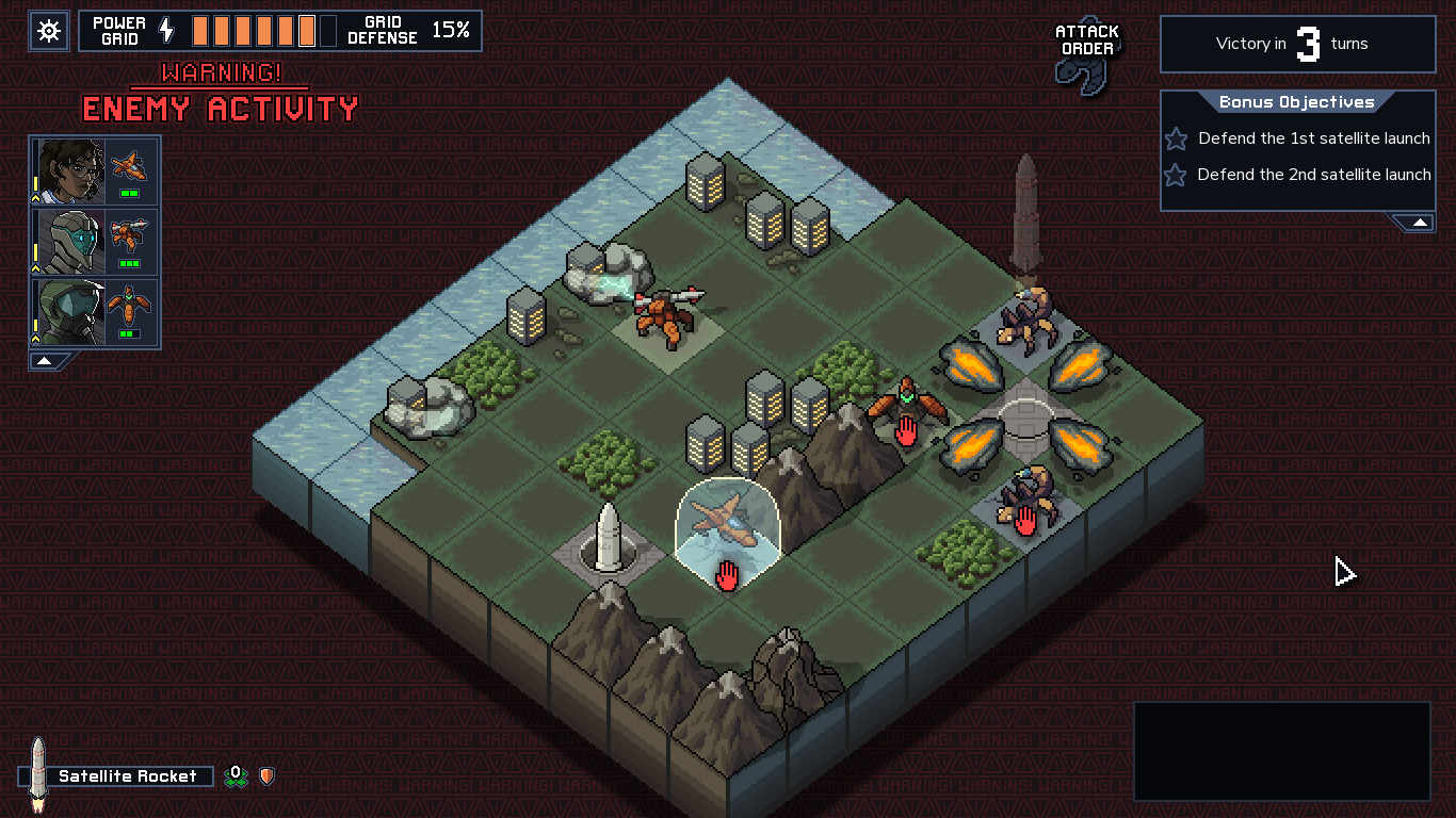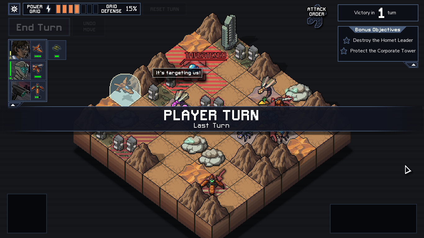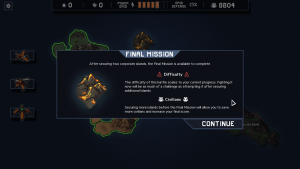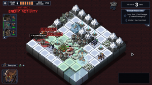Actual combat is filled with ingenious little touches, like starting a battle by having enemies move first and plot out their actions they’ll execute after you end your turn. The challenge then becomes ruining those plans, which becomes difficult the more enemies populate the field. A battle can go from great to a disaster in a flash, so it’s vital you try planning ahead and positioning your mechs in ways that will make them useful for what may come and just not the immediate here and now. It distills the complexity of larger strategy games into short mini-battles that can be over in just a few minutes, creating the backbone for the addicting element of the game. Letting you select what missions you want to do on each island, but limiting what you can do based on what area you re-capture, gives the player just enough control and freedom to prevent the game from feeling restrictive.