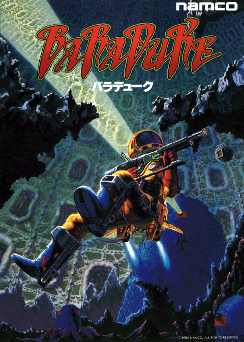 Just like Metroid one year later, Namco's Baraduke keeps its heroes in a suit that conceals their gender until the very end (and even then the game proclaims: "You are a brave man"). Unlike Samus Aran, their names are a bit of a giveaway, as they sound rather feminine. In the original game, player one is called Kissy and Player two is Takky. In the sequel, Takky is promoted to player one and Hommy is newly introduced as player two. One of the them, presumably Toby Masuyo, is later brought back as a supporting character in the Mr. Driller series, of all things.