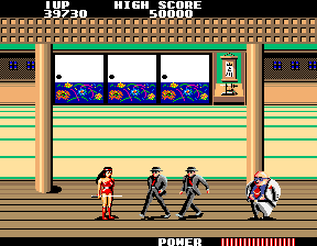 The eponymous protagonist of Sega's Flashgal is Wonder Woman. She may be called "Flashgal" for the sake of copyright, but just look at her! As a superheroine clearly inspired by DC's star-spangled Amazon, Flashgal is devoted to punching out crime. The criminal empire in question seems to be headed by a stocky and short bald man in a white suit and shaded glasses, a rather unlikely main villain. The main baddies are gray-suited thugs who look vaguely organized crime-ish, but you can also expect other enemies like hard-to-hit dogs and obnoxious kung-fu fighters who take more than one hit. To break up the potential monotony of beating up mafia goons, there are some levels that take place on vehicles.