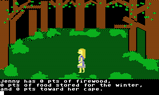 Jenny of the Prairie is a special relic in video game history, as it was the first game that has been documented as created by women, made for girls and starring a girl. It is a graphical survival adventure where Jenny has to find firewood and food for the winter, as well as make a cape for herself. Rihannon Software intended to put out an entire series of games with different themes by creators Elisabeth Stott and Lucy Ewell. The others where titled Cave Girl Clair, Chelsea of the South Sea and Lauren of the 25th Century. Due to the low profile status of most old edutainment software, it's hard to tell which games after Jenny of the Prairie have actually been published, but at least Cave Girl Clair was also completed, and an IBM PC version was dumped recently.