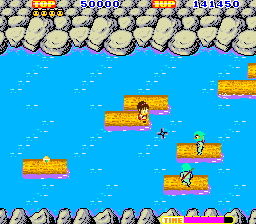 Irem is mostly known for the shoot-'em-up series R-Type, but in its early days the company gave Japan its first female video game protagonist. Unsurprisingly the pixel artist went for full sex appeal: The lady waterskis in a bikini, with the bottom hanging suspiciously low. It's also possible to turn around to expose her front, which makes it impossible to steer but is rewarded with bonus points. On the US flyer she is sporting more demure swimwear, but is also shown as needing the guidance of some dude, while she's perfectly fine on her own in the game.