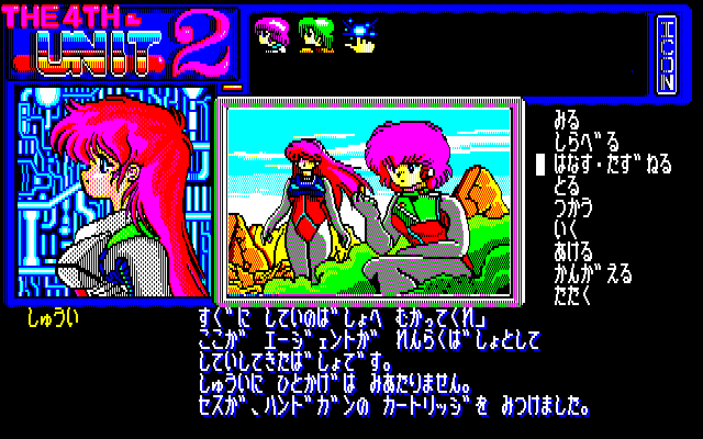 While The 4th Unit goes completely unknown in the West, in Japan it was actually one of the most massive adventure game series during the late 1980s and early '90s, spanning no less than seven titles on various home computer platforms. The heroine with the unusual name is first introduced as an amnesiac, but she was hired as an agent for the Joint Forces to solve all kinds of mysterious crimes. The games are set in a not too distant future, along with the typical cyberpunk elements like evil corporations that control the world, artificial humans and the like. Remarkably for Japanese computer games, the series never seems to go overboard with sexual content, at least from what we've seen. The third game introduces a command for the player to input Blon-Win's emotions.