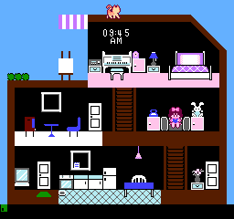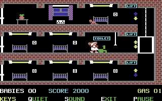 This game puts you at the command of a whole cohort of Mad Nurses, who serve as additional tries should one of them get fired for neglect. They all have comical names like Brenda Bumwash, Cathy Cuddlecare or Fiona Feedface. Their task is to grab up the toddlers that storm each ward, and carry them into their beds. Disturbing fact no. 1: Never, ever let a baby get too close to a power outlet. The SID screaming will scar you for life. Disturbing fact no. 2: The nurses' main means to prevent this should things get too heated is by gasing the house to temporarily stun all the babies.