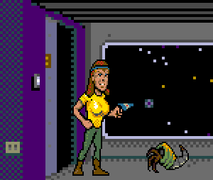 There are nine different playable characters in Midway's Xenophobe, three for each of the three players. Amidst some really odd characters like Dr. Kwack the duck, there's Dr. Udderbay. Most of the characters have different heads but identical bodies - Dr. Udderbay really only looks like a woman due to her figure. Also, maybe naming her character after a slang term for breasts maybe wasn't the best idea. Even though she is missing from most of the console ports, many of those still show a female space soldier on the cover or ingame art.