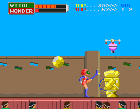 The developers of this arcade game at least gave some personality to Wonder Momo, who mimics the MGM lion roar when the game boots up. She reveals quite a bit of leg when she kicks, pretty much inventing the saying "she kicks high" well before any of the Dead or Alive girls. The game makes her the heroine in an homage/parody to cheapo tokusatsu series (which in the West are most well known by Power Rangers), where she gets to fight villains with silly costumes, like bugmen and creepy masked men in black leotards. Momo of course can transformed into an uniformed justice fighter, who fights with a yellow hoola hoop.