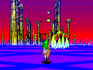 Phantis starts out as a horizontal scrolling shoot-'em-up, but as soon as the protagonist leaves her spaceship to mount a Tauntaun, she is revealed as the busty, scantily clad space warrior Major Locke. The game actually is a sequel of another title called Game Over, whose hero Arkos has been captured on the planet Phantis, and so it is Locke's mission to go rescue him. When the originally Spanish game made it to the rest of Europe under the name Game Over II, however, Major Locke was put in a full body combat armor like Arkos in the previous game, and is referred to as a "he", because as everyone knows women only gain protection by wearing fewer clothes, contrary to men.