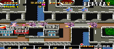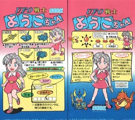 Sega's Teddy Boy Blues was one of the first games to tie-in with a Japanese pop star, featuring music and a cameo appearance by Youko Ishino. Vic Tokai's UFO Senshi Youko-chan, also published on Sega hardware, goes one step further by turning J-Pop idol Youko Minamino into a playable character as she fights off an alien invasion. The BGM in the game is based on her songs "Hanashi kaketakatta", "Sayonara no Memai", "Kanashimi Monument" and "Kaze no Madrigal".