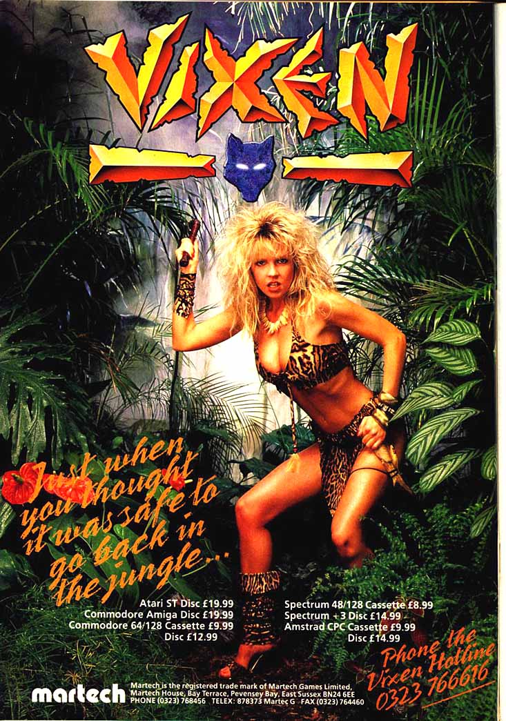 Loosely inspired by Pitfall!, in this Commodore 64 game, you control the eponymous heroine as she fights through the jungle. At times, she can turn into a snake, hence the punny name. The primary reason for this game's existence seems to the title screen, which, in true Farrah Fawcett fashion, features the heroine in a skimpy outfit in what's probably a very cold room.