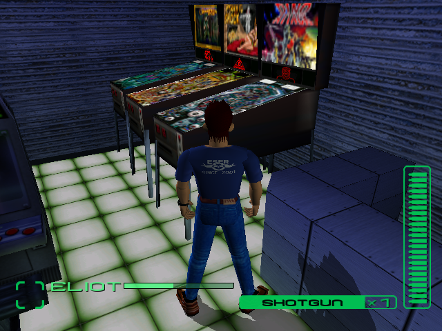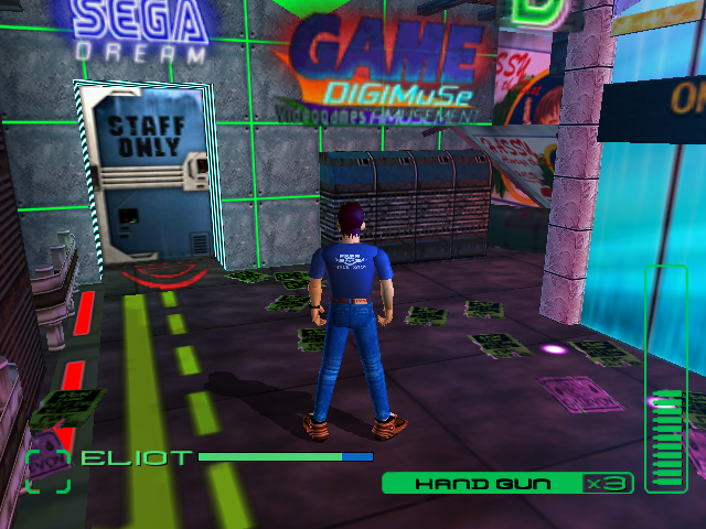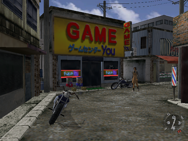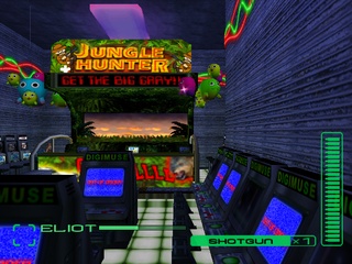 Although the company was known for their cheesy horror, the late Shinya Nishigaki's Crazy Games was a very game meta friendly joint, as both of their major titles contain a bunch of references. Along references like collecting coins from defeated enemies (which fling around suspiciously similar to Sonic's rings), Blue Stinger, the heart-warming Christmas tale on an island overrun by ghastly parasites that turn humans into bloodthirsty monsters, also features a game center. "GAME DIGIMuSe" openly betrays the developer's close partnership with Sega right on the front door. Unfortunately, all of the generic cabinets inside are out of order, and neither the pachislots nor the pinball tables are interactive, either. The only thing you can "play" is the big "Jungle Hunter" shooting gallery, where all it takes is destroying three cardboard animals with your real gun to win a Big Gary plush toy. (Which of course you couldn't have just plucked from the ceiling to give to the little girl in the corner).