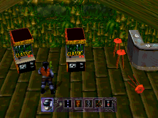 The 3D rendition of Contra is widely known as one of the low points of the series. Less widely known - because most players couldn't be bothered to hold out until the second stage - is the little jungle arcade it is home to. The establishment only has two machines labeled as "Arcade Classic", but both of them are playable and actually different games. The first is a clone of Konami's own Gyruss, the other a tank maze action game similar to Namco's Tank Batallion. Fortunately you don't actually have to play Legacy of War to see them - they can also be accessed via cheat codes.