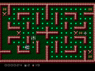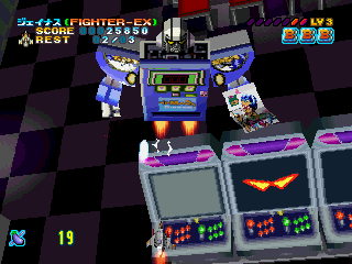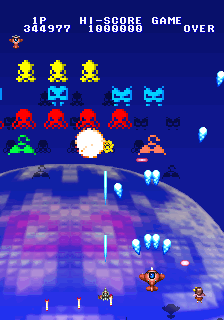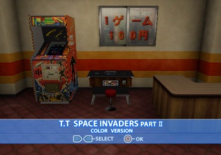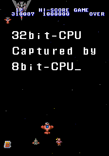 The next few stages lead you through typical shoot-em-up and racing game worlds, but you're still attacked by guys in appropriate sit-down cabinets throughout. Then the game puts out the message "32bit-CPU Captured by 8bit-CPU", and attacking ships turn into Galaxian enemies. The demake area further comprises parodies of Space Invaders, Head-On and Breakout.