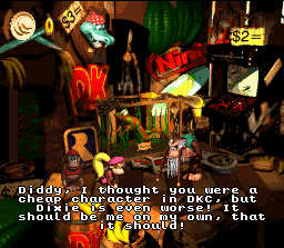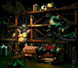 In this installment, Cranky Kong is selling a worn old arcade machine for $2 in his Monkey Museum (next to a bunch of SNES carts and a huge SNES joypad, strangely). At the side, it is labeled "KI", in reference to Rare's fighting game Killer Instinct. Its position on the map screen of Krazy Kremland is depicted as a tent with a banner saying "KI here" and some tiny weeny arcade machines at the front.