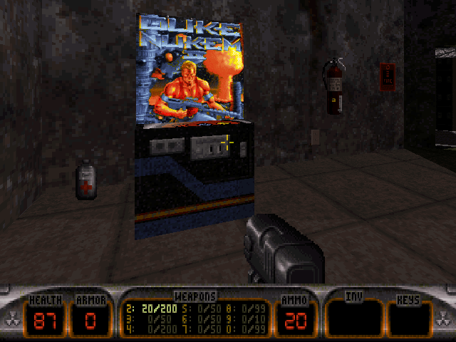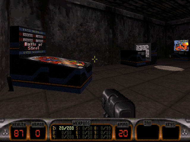 The area in the first stage of Duke Nukem 3D is no doubt one of the most famous arcades inside a game, even though no machine is playable. If the player tries to interact with the Duke Nukem II cabinet, Duke proclaims: "I don't have time to play with myself." The room is also home to a nameless sit-down cabinet, whose screen only shows static, and the "Balls of Steel" pinball table, which returns in playable form in Duke Nukem Forever, although in a strip club instead of an arcade.