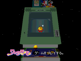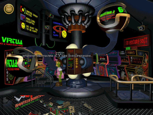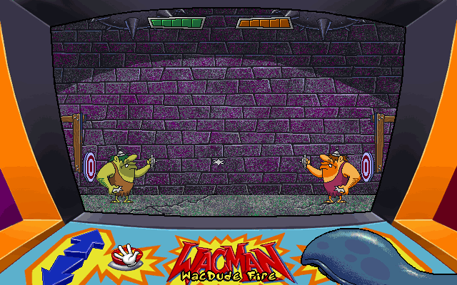 Cutopia's arcade is just as distorted as the rest of the Toonstruck world, but somehow the machines are functional in spite of their shape. However, two out of three are always occupied by unlicensed Carebear cameos. Only "Wacman", the game in the center, is free for Christopher Lloyd as Drew Blanc to play. In it, two caveman-style warriors throw shuriken at each other, which they can deflect with their shields.