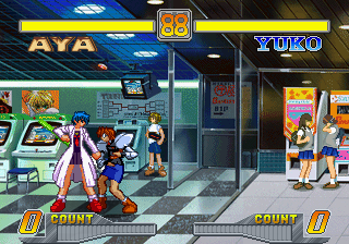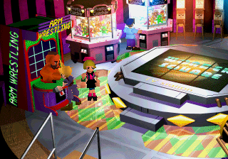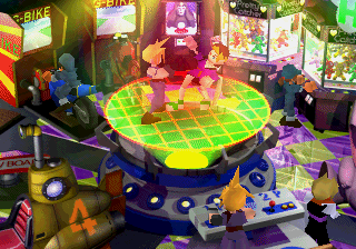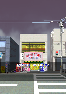While not as frequent as beat-em-ups, there have been a few stages in fighting games that take place in or around arcades, too. In Bishōjo Senshi Sailor Moon S we get to see Game Center Crown again. The Super Famicom version only features a look from the outside, but the 3DO port takes the fighting indoors, with a pretty good look on the "Sailor V" game running on the cabinet screens.
