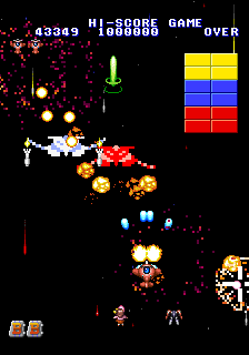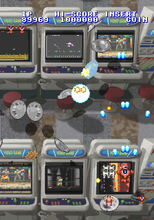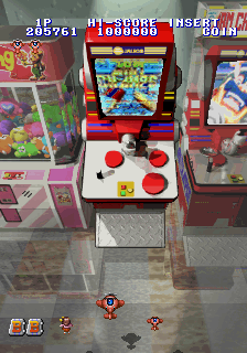 This shoot-em-up by Jaleco takes place entirely within an arcade, the "Game Stage You & Me", which is attacked by a mysterious villain sporting a thorougly twirl-worthy mustache. The first stage has one (or two) of the four heroes flying across lots of generic cabinets with games running on them, before the journey goes on over a huge pinball table and through the plush toy compartment of an UFO catcher.